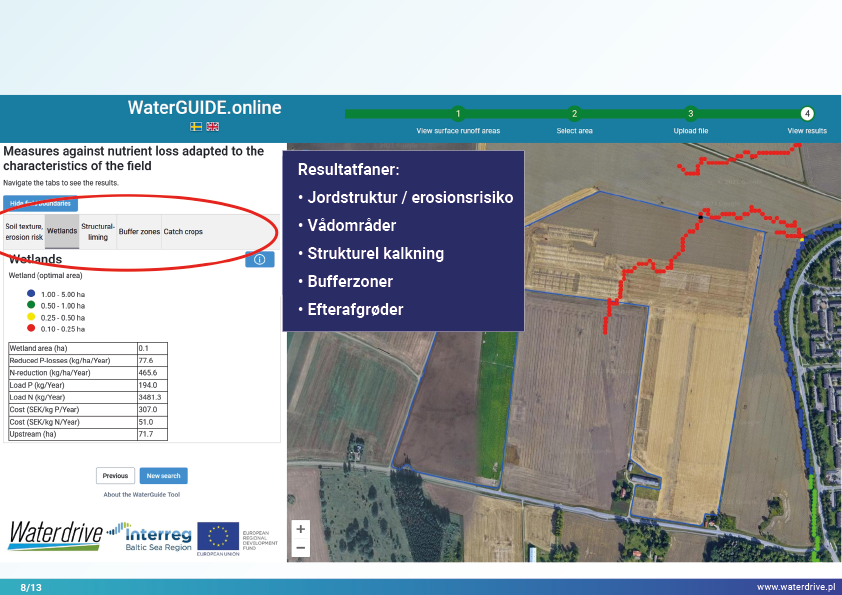 WaterGUIDE online (https://waterguide.online/nutrient-loss) er en første version af et interaktivt beslutningsstøttesystem (DSS) til optimering af valget af afbødende foranstaltninger (konstruerede vådområder, strukturel kalkning, bufferzoner og efterafgrøder), samt deres placeringer.