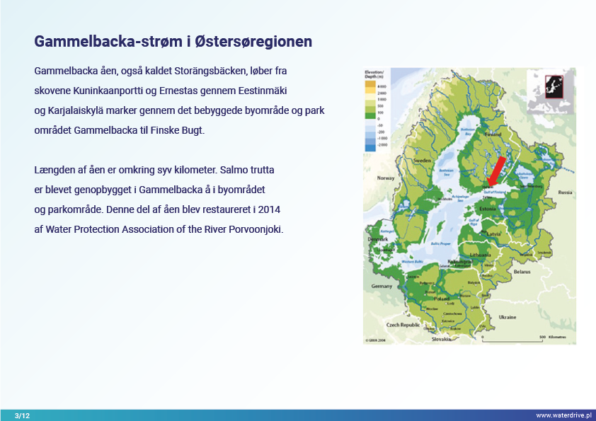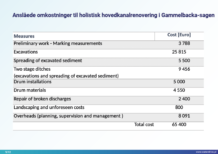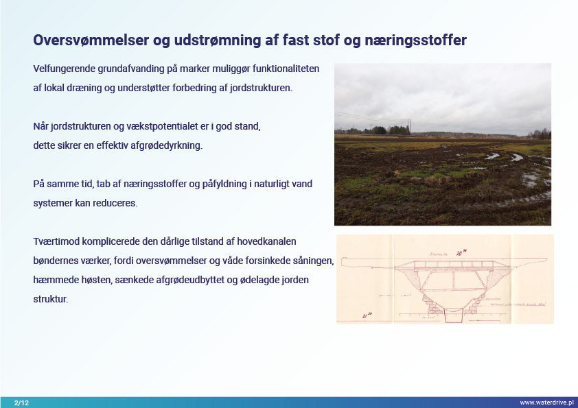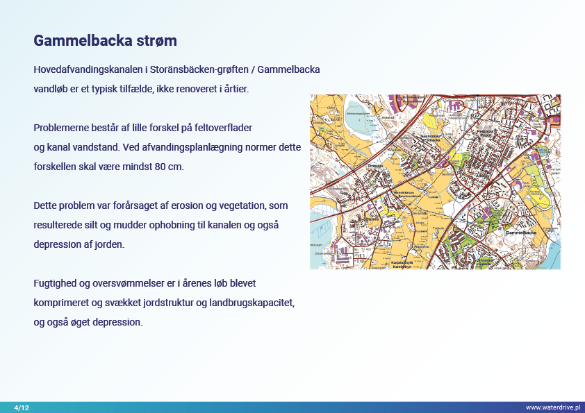 Hovedafløbskanalen i Storänsbäcken-grøften / Gammelbacka-strømmen (Finlandia) er et typisk tilfælde, der ikke er blevet renoveret i årtier. Den dårlige tilstand af hovedkanalen komplicerede landmændenes arbejde, fordi oversvømmelser og våde forsinkede såning, hæmmede høst, sænkede afgrødeudbyttet og ødelagde jordstrukturen.