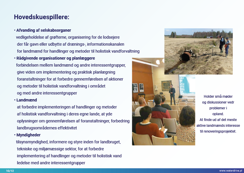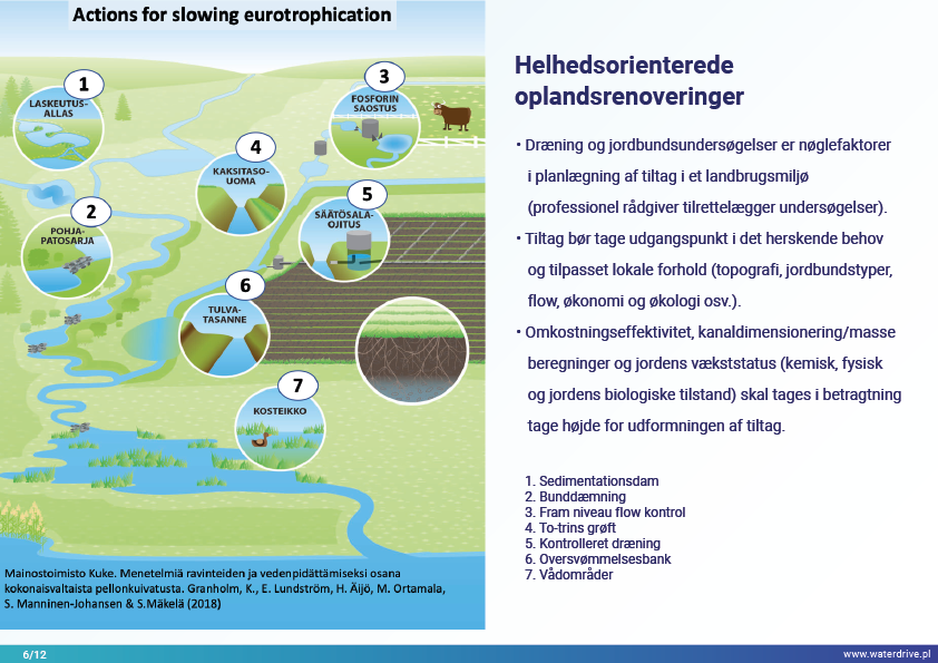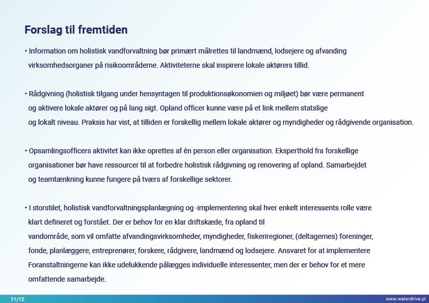 Implementering i oplandsskala af holistisk vandforvaltning garanterer sandsynligvis det bedst mulige resultat for både dræning og jordstrukturforbedring og minimering af næringsstoftab til vandområder under hensyntagen til biodiversitet, vandkvalitet og fiskeri.