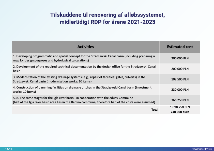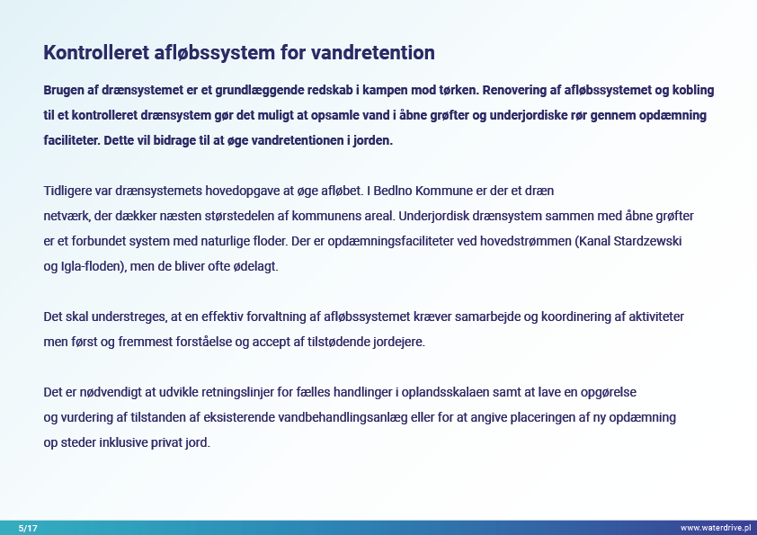 Området Kutno County er et vigtigt landbrugsproduktionsområde i Lodz-provinsen (Polen), som blev hårdt ramt af tørke i 2018 og 2019. Renovering af drænsystemet og overgang til et kontrolleret/dobbeltfunktionsdræningssystem er en væsentlig foranstaltning i kampen mod tørken.