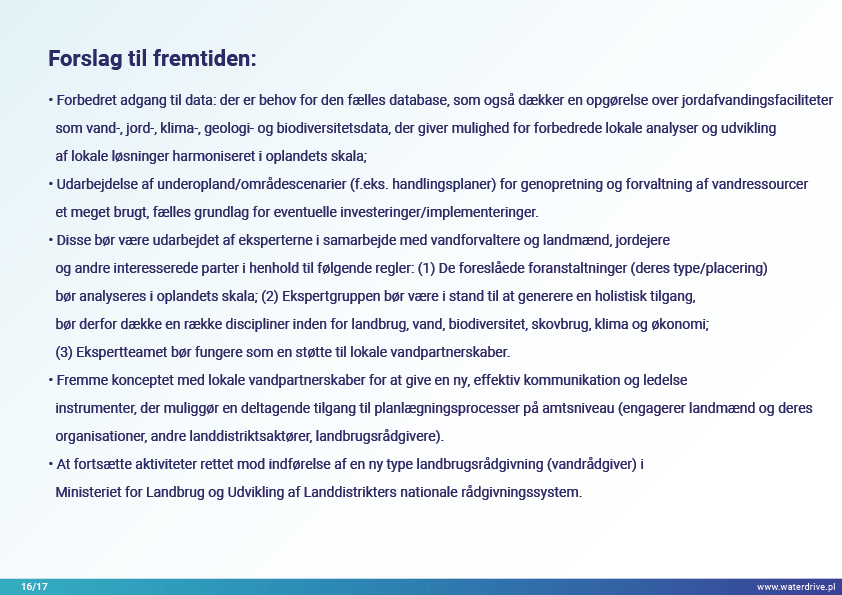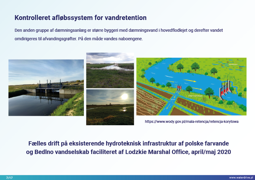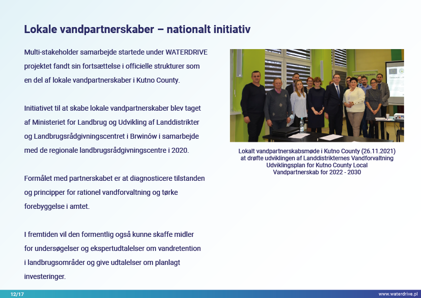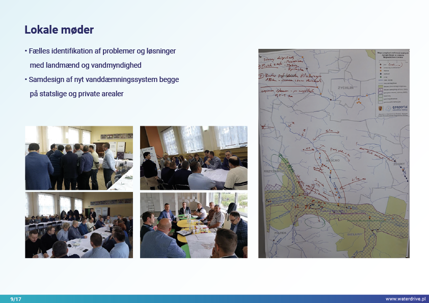 Vi præsenterer fremskridtene for lokalt samarbejde med flere interessenter for at øge vandretentionen, hvor hovedaktørerne er vandselskaberne (frivillig sammenslutning af landmænd) og National Water Holding Wody Polskie. Regionale og nationale initiativer har stærkt stimuleret lokale tiltag.