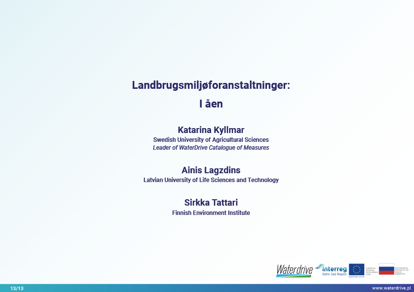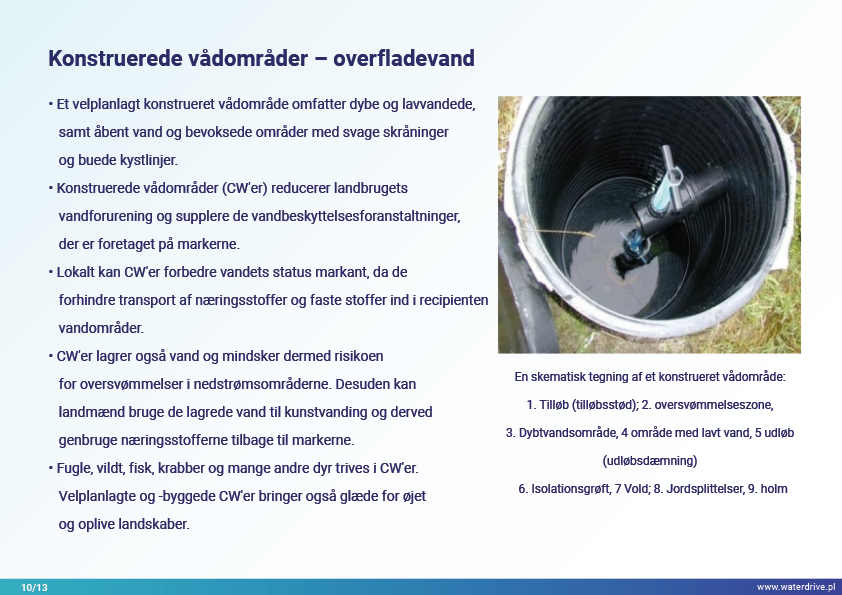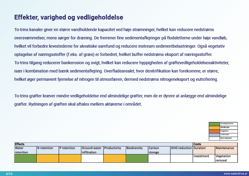 Den sidste gruppe af foranstaltninger, der præsenteres i Waterdrive Catalogue of Measures (https://www.slu.se/waterdrive) er landbrugsmiljøforanstaltninger, der er direkte relateret til akvatiske økosystemer: to-trins grøfter og konstruerede vådområder. Genopbygning af kanaler eller regulerede vandløb bestående af afgrænsning af hovedrenden og flodsletteterrasser tjener til beskyttelse mod oversvømmelser og tørke, selvrensning af floder og øget biodiversitet.