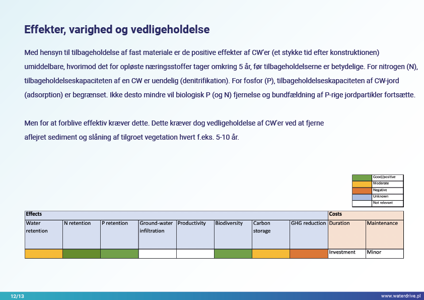 Også anlæggelse af kunstige vådområder, både med overflade- og underjordisk strømning, er en løsning med mange miljømæssige fordele. Først og fremmest har de evnen til at reducere forureningen, øge vandretentionen og skabe nye levesteder og dermed øge biodiversiteten.