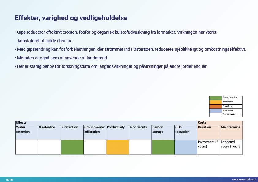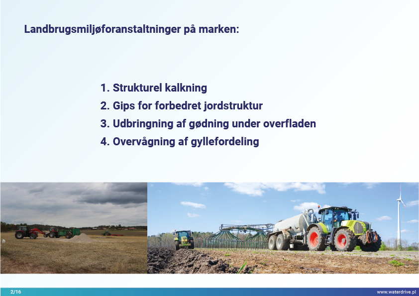 I Waterdrive Catalogue of Measures (https://www.slu.se/waterdrive) blev der udvalgt to tiltag til forbedring af jordstrukturen: strukturel kalkning og gipspåføring, som reducerer jorderosion. De næste to præsenterede tiltag, underjordisk udbringning af gødning og overvågning af gødningstilførsel i oplandsskalaen, indikerer potentialet for bæredygtig gødningsudbringning for at hjælpe med at reducere vandforurening.
