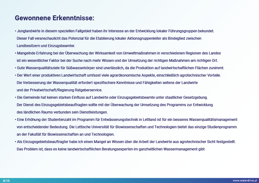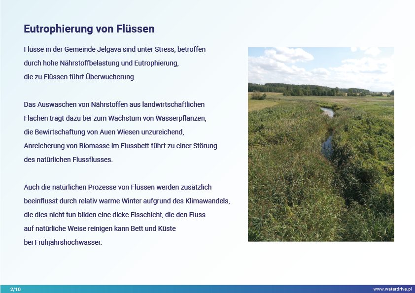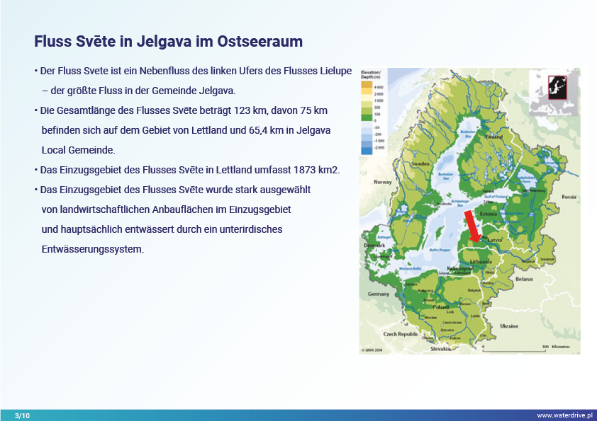 Flüsse in der Kommune Jelgava (Lettland) stehen unter Stress, da sie von hohen Nährstoffbelastungen und Eutrophierung betroffen sind, was zu einer Überwucherung der Flüsse führt. Während des Waterdrive-Projekts im Einzugsgebiet des Flusses Svete konzentriert sich der örtliche „Testeinzugsgebietsbeauftragte“ auf die theoretische Umsetzung der Renaturierung von Feuchtgebieten, zweistufiger Gräben, Phosphordämme, konstruierter Feuchtgebiete und intelligenter Pufferzonen.
