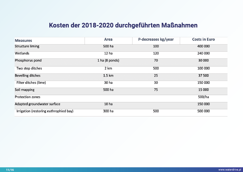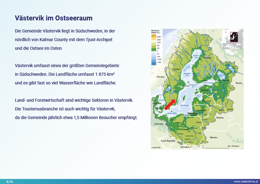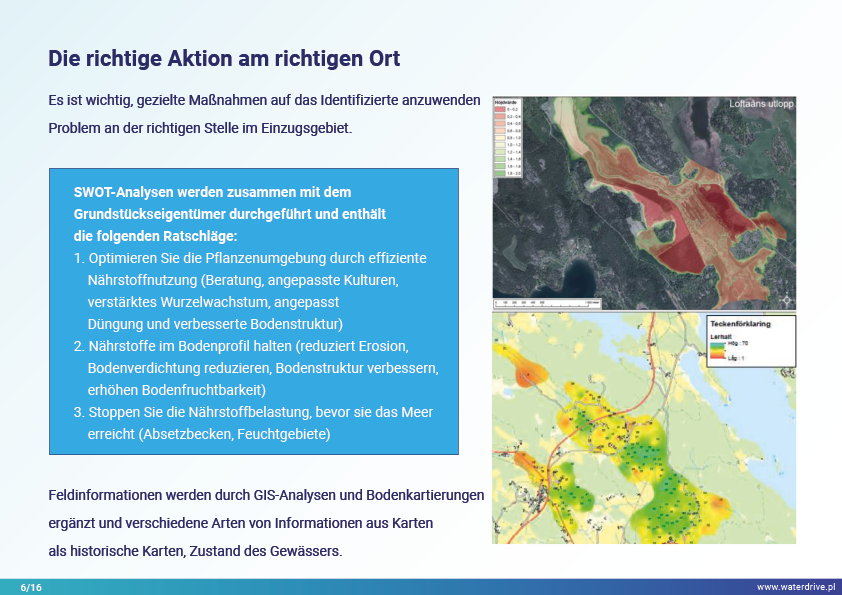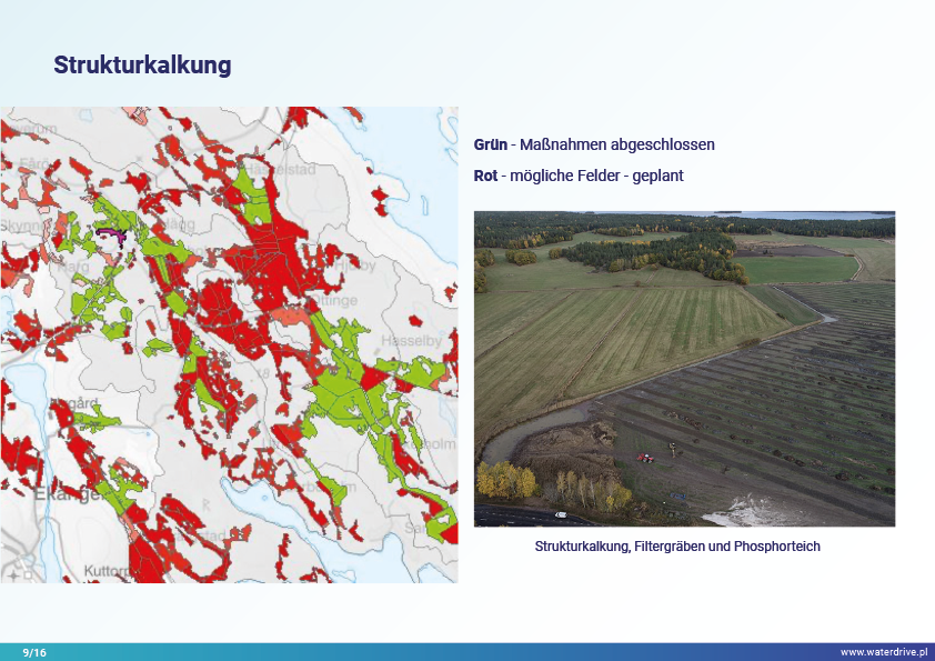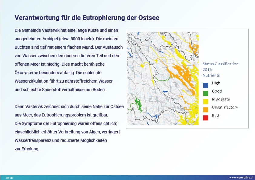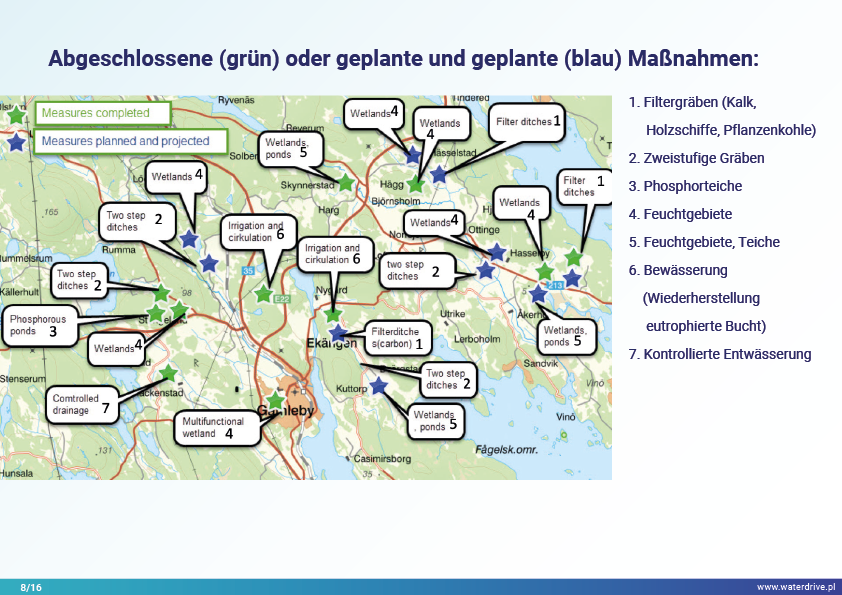 Die Gemeinde Västervik (Schweden) hat eine lange Küste und einen großen Schärengarten in der Ostsee. 2017 wurde der Lokale Aktionsplan zur Verringerung von Nährstoffverlusten zur Verringerung der Eutrophierung der Ostsee verabschiedet. Der Plan nennt eine Reihe von Minderungsmaßnahmen, die in landwirtschaftlichen Gebieten angewendet werden sollten (z. B. strukturelle Kalkung, Filtergräben, zweistufige Gräben, Phosphorteiche, Feuchtgebiete und kontrollierte Entwässerung). Die Maßnahmen wurden auf die identifizierte Problematik abgestimmt und der Standort im Einzugsgebiet optimal gewählt.