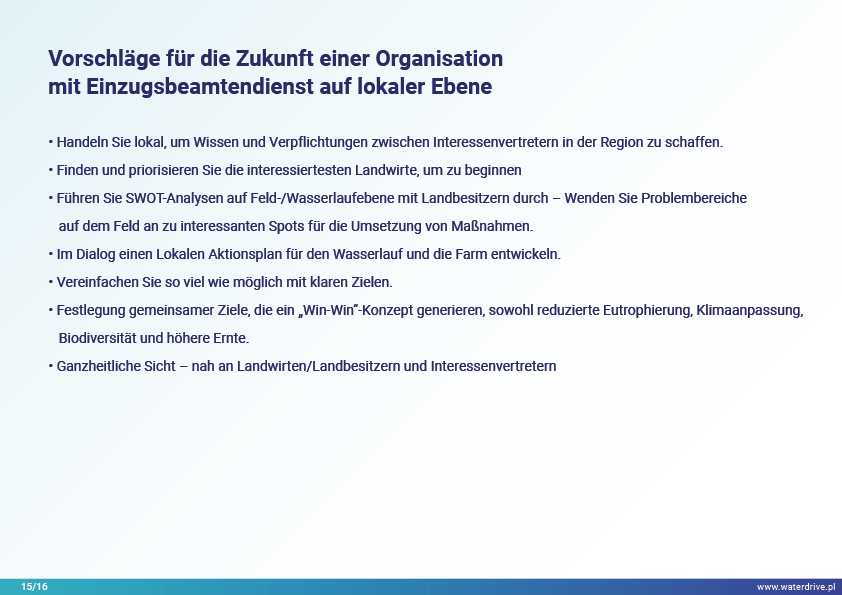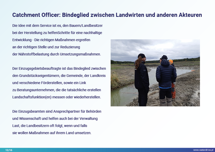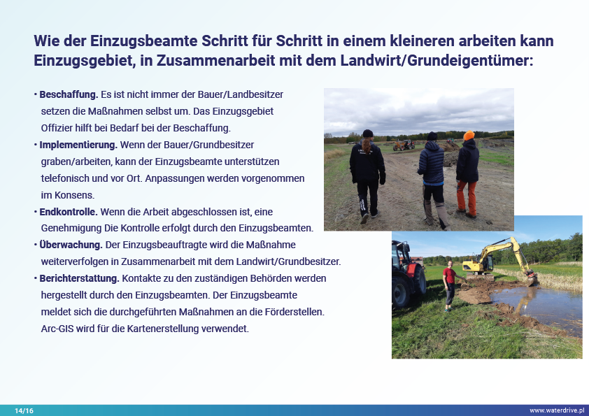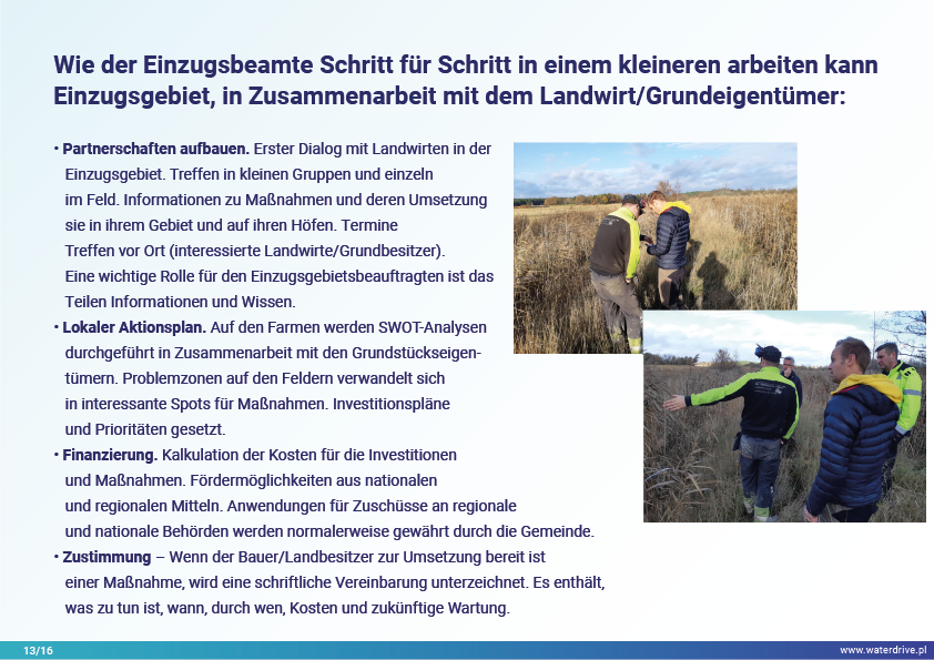 Die Idee „Die richtigen Dinge am richtigen Ort tun“ begeistert alle Partner des Waterdrive-Projekts. Erfahrungen aus der Arbeit eines Einzugsgebietsbeauftragten in Zusammenarbeit mit Landwirten und Landbesitzern bei der Umsetzung des Aktionsplans werden vorgestellt.