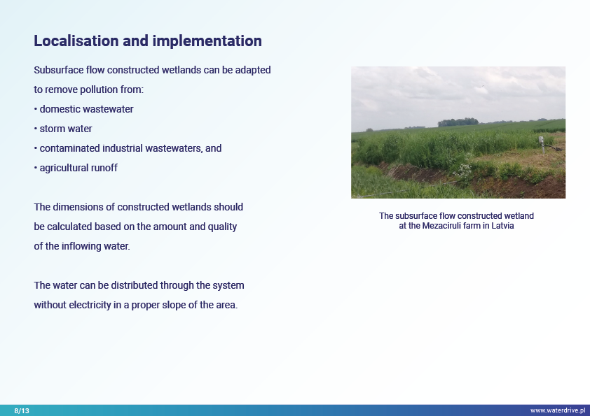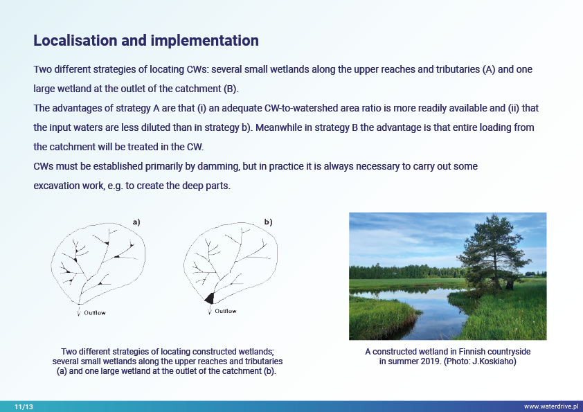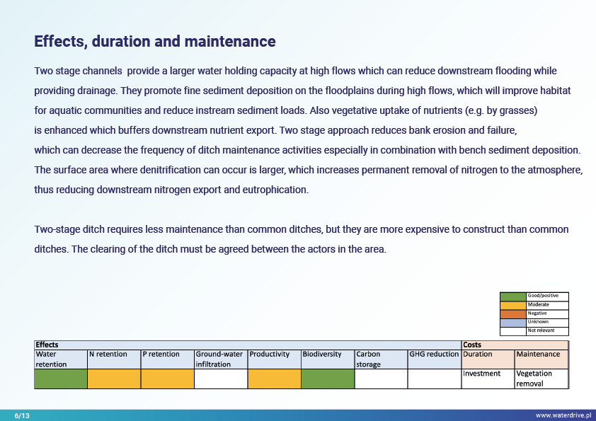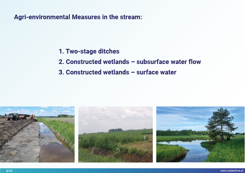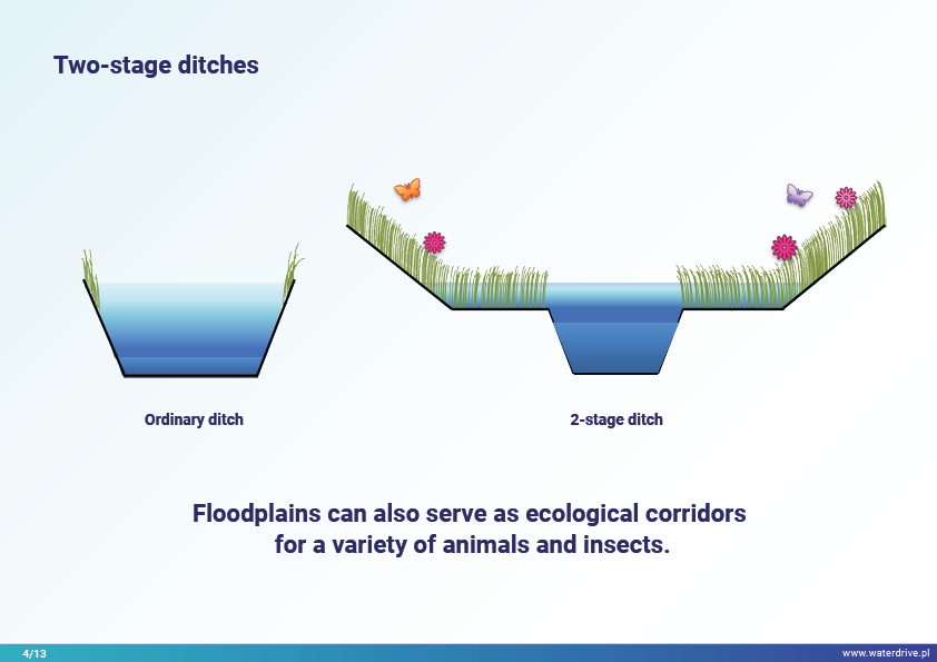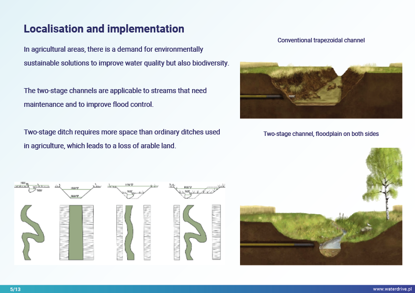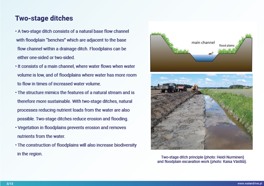 The last group of measures presented in the Waterdrive Catalogue of Measures (https://www.slu.se/waterdrive) are agri-environmental measures directly related to aquatic ecosystems: two-stage ditches and constructed wetlands. Reconstruction of channels or regulated watercourses consisting in delineation of the main channel and floodplain terraces serves the protection against flooding and drought, self-purification of rivers and increase of biodiversity.