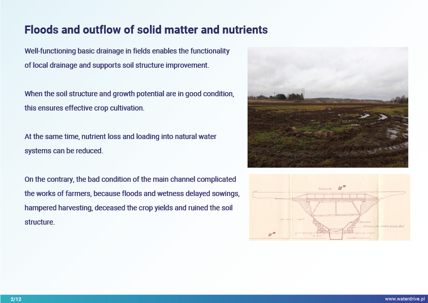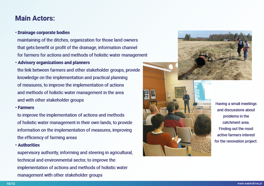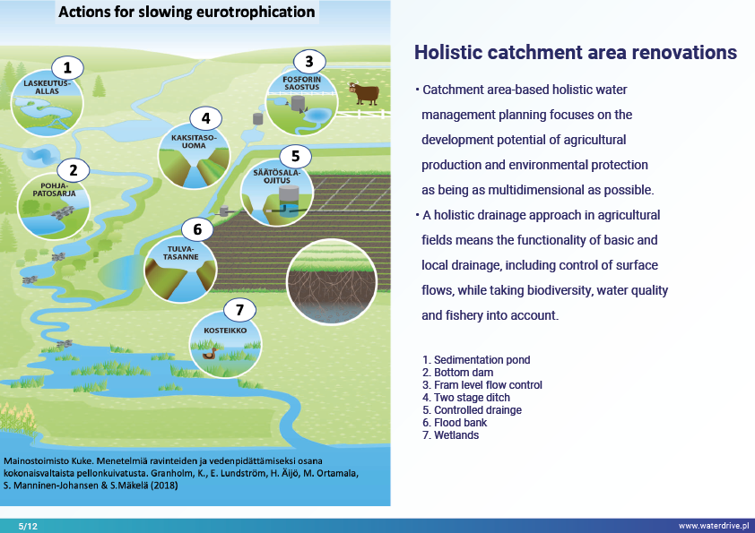 Catchment-scale implementation of holistic water management probably guarantees the best possible result for both drainage and soil structure improvement and minimization of nutrient losses to waterbodies taking into consideration biodiversity, water quality and fishery.