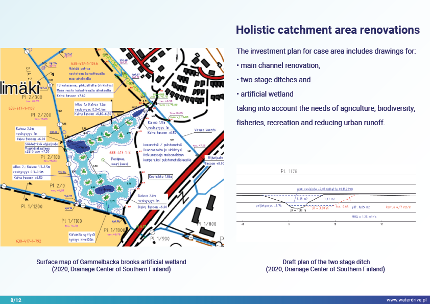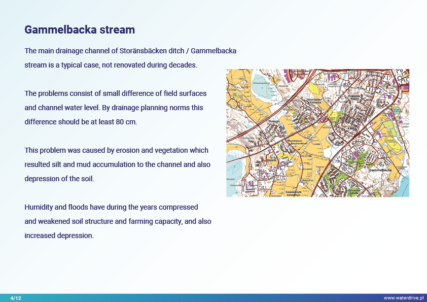 The main drainage channel of Storänsbäcken ditch / Gammelbacka stream (Finlandia) is a typical case, not renovated during decades. The bad condition of the main channel complicated the works of farmers, because floods and wetness delayed sowings, hampered harvesting, deceased the crop yields and ruined the soil structure.