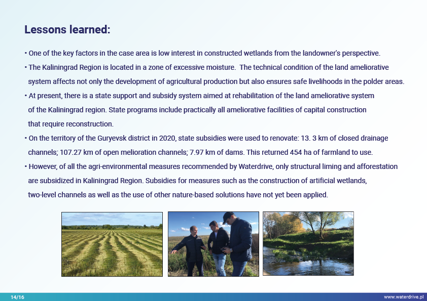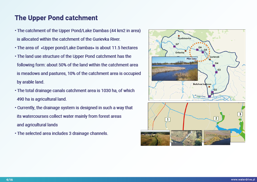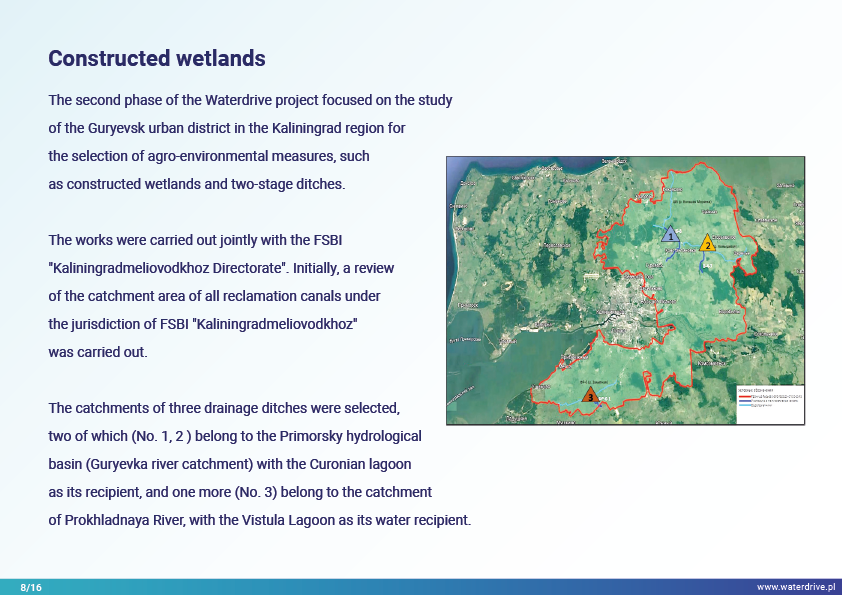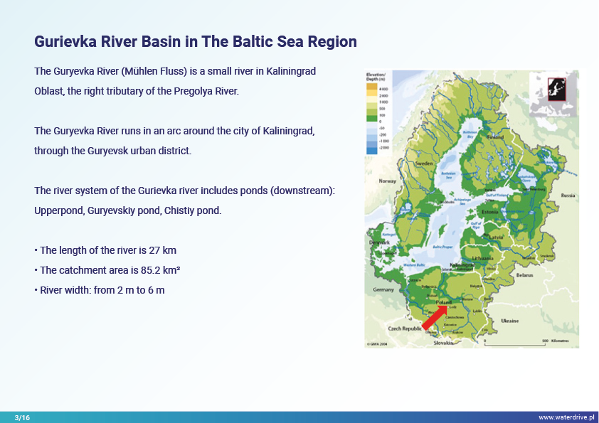 The Guryevka River (Mühlen Fluss) is a small river in the Kaliningrad region whose main sources of pollution are human settlements, industrial plants and agriculture. During the Waterdrive project, water quality monitoring was performed and showed that nitrogen and phosphorus concentrations increase with the river flow from source to mouth. The results of the feasibility study on the construction of artificial wetlands were presented, as well as the ongoing activities related to the restoration of land melioration system. Numerous conferences, meetings and "round tables" were held to raise awareness of modern agri-environmental measures.