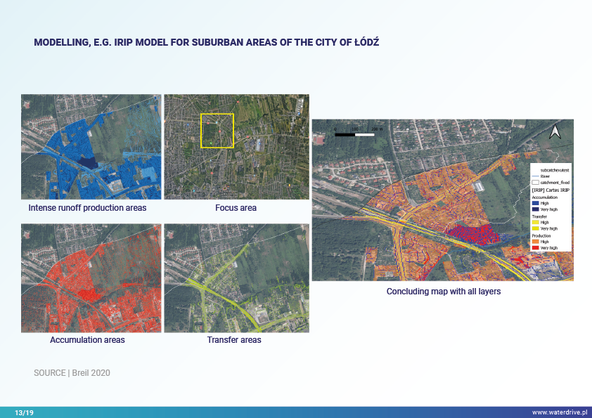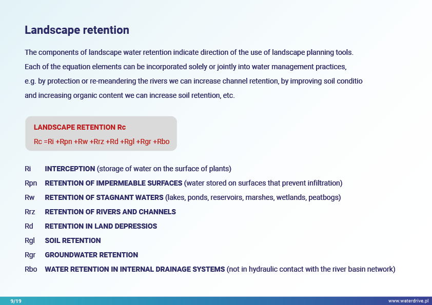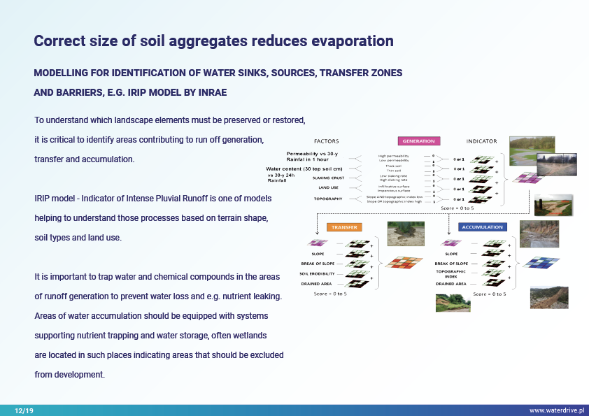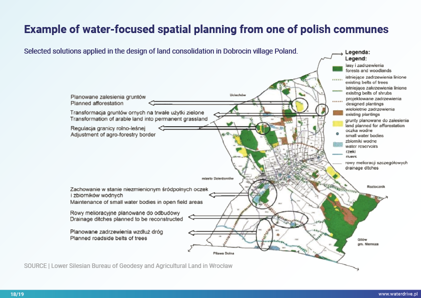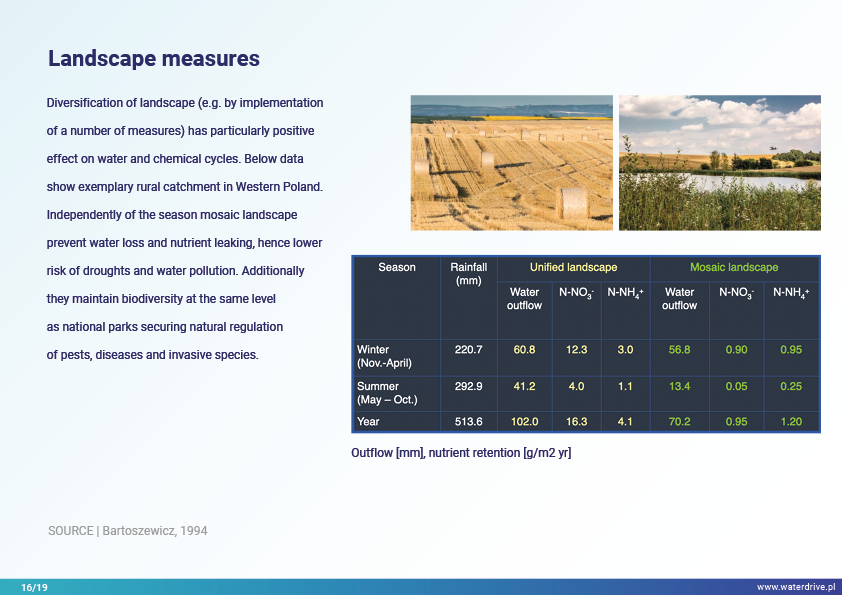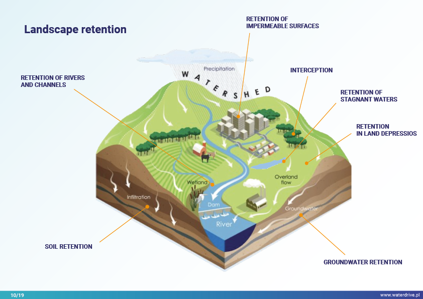 In the area of water management we deal with only three, but rather critical challenges – there is too little, or too much water or it is polluted. Those issues are usually interconnected, thus solving one may eventually deepen the other (like flood protection in cities based on efficient water outflow, what contributes to UHI and groundwater table drop). The shortage or surplus of water happen subsequently as a result of seasonal rainfall variation, problems with water distribution and use intensity. Shortage of water impacts soil structure making it less permeable, triggers wind erosion, deteriorates ecosystems acting as water storages: rivers, lakes, ponds, wetlands, forests and increases concentration of pollution in water bodies. Water overflow causes water erosion, washing out pollution, hydraulic impact on rivers. With increasing climate variation and more intense water use in agriculture, those processes will most probably intensify in next decades.