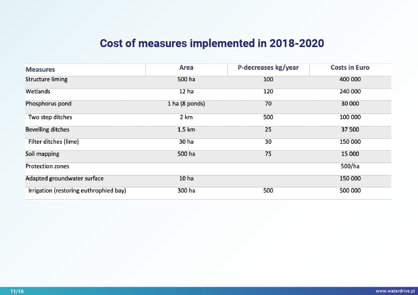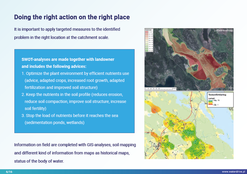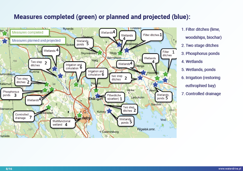 The municipality of Västervik (Sweden) has a long coast and a large archipelago in the Baltic Sea. In 2017, the Local Action Plan to Reduce Nutrient Losses in order to reduce the eutrophication of the Baltic Sea was approved. The Plan identifies a number of mitigation measures that should be applied in agricultural areas (e.g. structural liming, filtr ditches, two step ditches, phosphorus ponds, wetlands and controlled drainage). The measures were matched to the identified problem, and their location was selected as optimal in the catchment area.