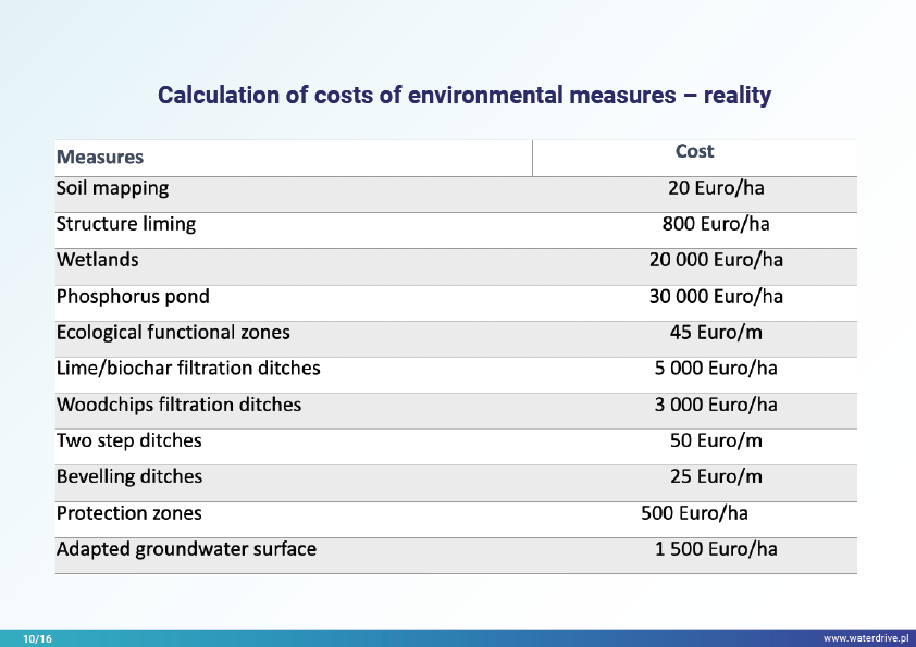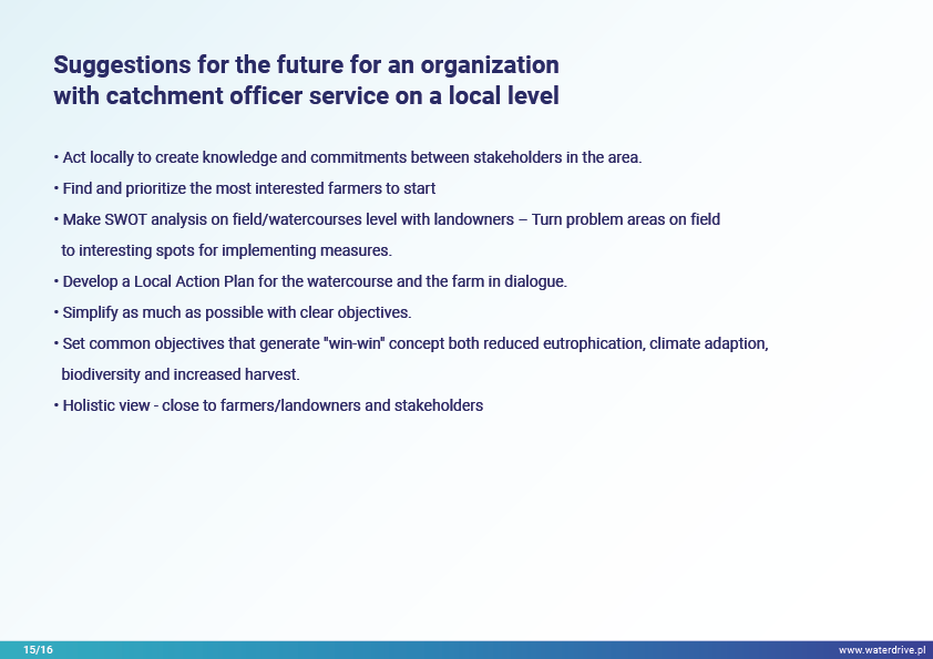 The idea of "Doing the right things in the right place" inspires all partners in the Waterdrive project. Experiences from the work of a catchment officer in cooperation with farmers and landowners in implementing the action plan are presented.