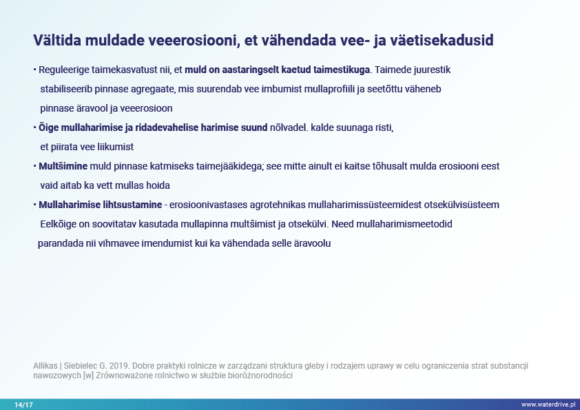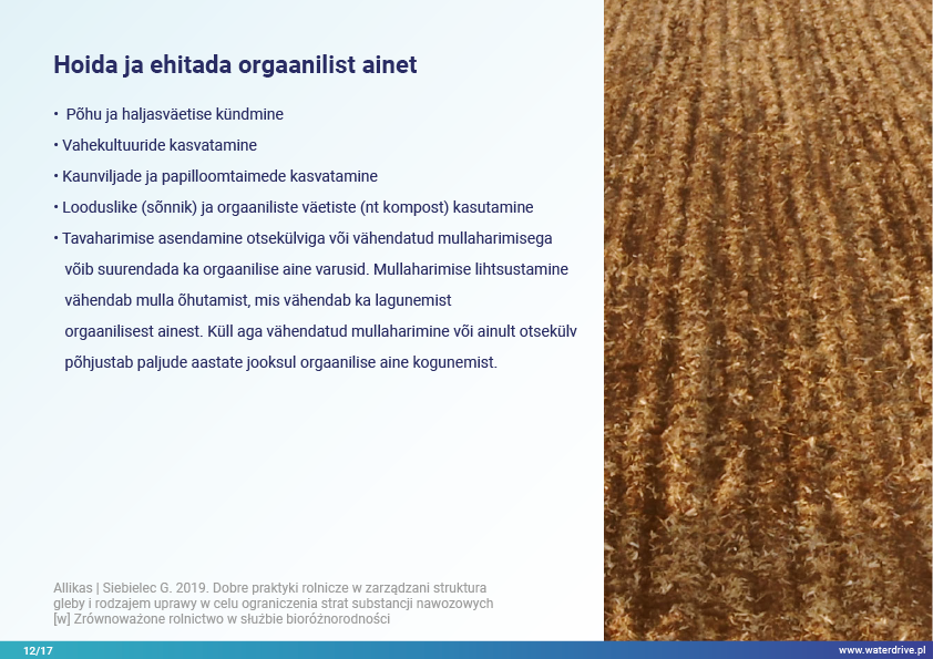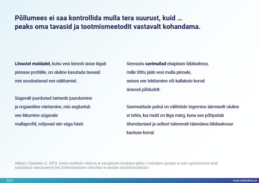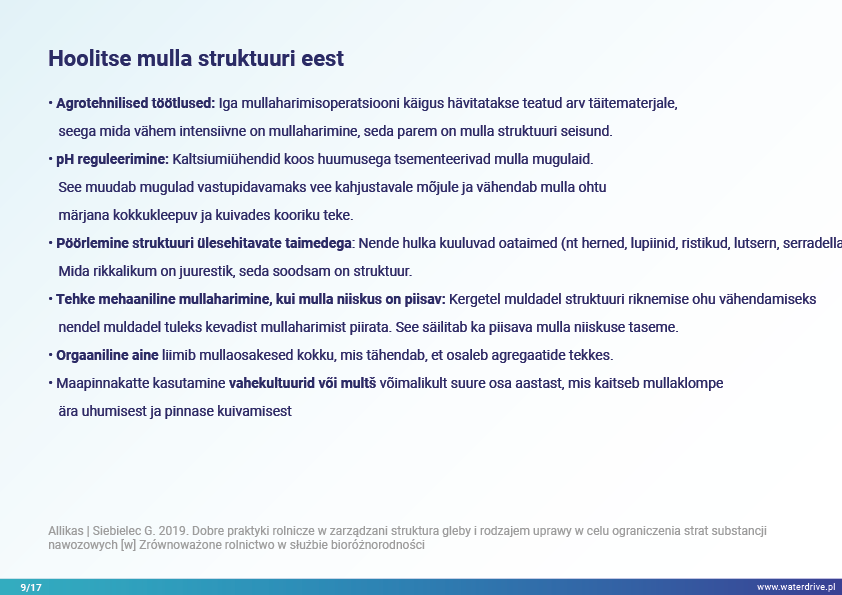 Käesolevas ettekandes keskendume mulla rollile veepidavuses ja seeläbi toitainete kadude ärahoidmisel. Näitame, millised head põllumajandustavad aitavad kaasa mulla struktuuri eest hoolitsemisele, mulla orgaanilise aine sisalduse suurendamisele ja mulla erosiooni piiramisele