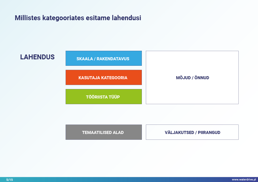 Lahendused põhinevad näidetel ja hõlmavad erinevaid teemavaldkondi põllumajandusmaa ruumilise planeerimise protsessis veemajandusega seotud eeldatavate keskkonnanäitajate saavutamise kontekstis.