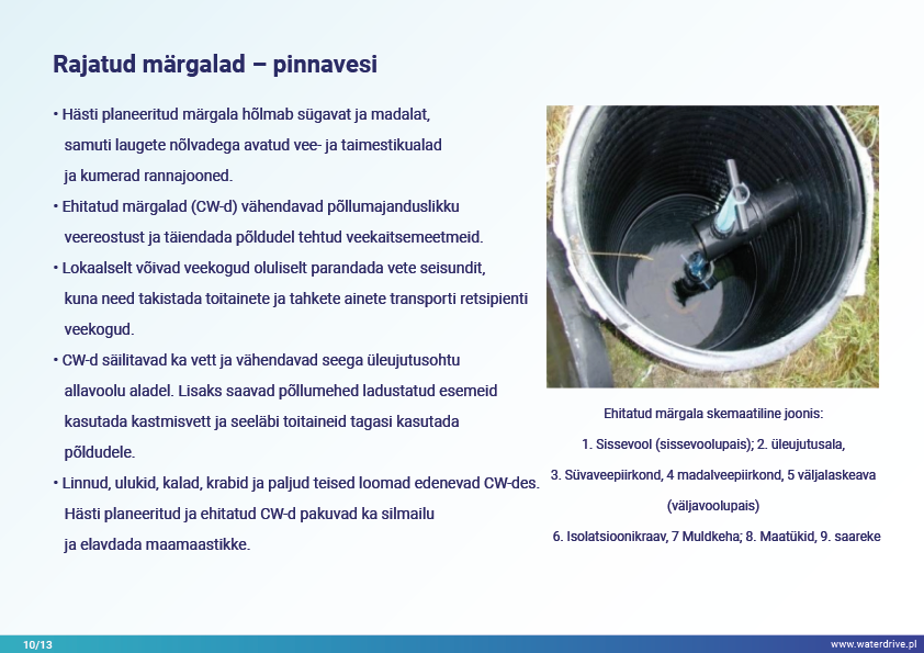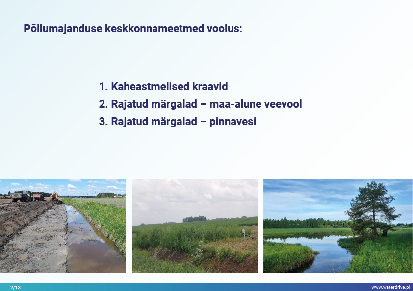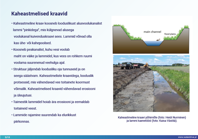 Viimane Waterdrive'i meetmete kataloogis (https://www.slu.se/waterdrive) esitatud meetmete rühm on otseselt veeökosüsteemidega seotud põllumajanduslikud keskkonnameetmed: kaheastmelised kraavid ja rajatud märgalad. Kanalite või reguleeritud vooluveekogude rekonstrueerimine, mis koosneb peakanali ja lammiterrasside piiritlemisest, teenib kaitset üleujutuse ja põua eest, jõgede isepuhastumist ja elurikkuse suurendamist.