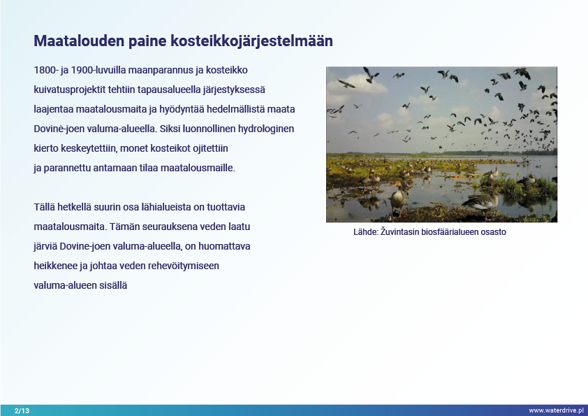 Dovinin valuma-alue (Liettua) on ainutlaatuinen alue, koska valuma-alueen rajojen sisällä sijaitsee 2 suojelualuetta – Meteliain aluepuisto ja Žuvintasin biosfäärialue. 1800- ja 1900-luvulla tapausalueella tehtiin maanparannus- ja kosteikkojen ojitushankkeita maatalousmaiden laajentamiseksi. Lyhyen aikavälin paikallisen vedenlaadun seurannan analyysi osoittaa mm. kalalammikoiden vaikutuksen veden laatuun. Esittelemme myös paikallisen yhteistyön aloitusvaiheesta opittuja kokemuksia.
