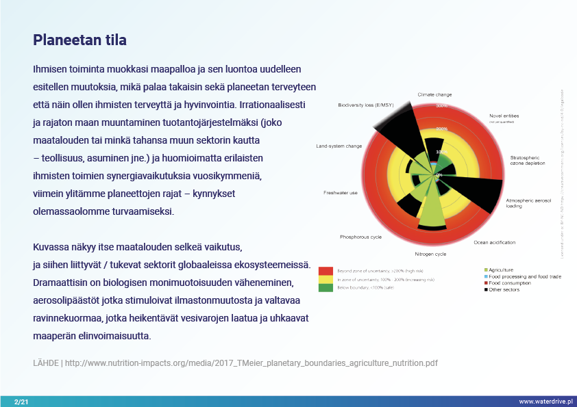 Ihmisen toiminta muokkasi maapalloa ja sen luontoa uudelleen tuoden mukanaan muutoksia, jotka palaavat sekä planeetan terveyteen että sen seurauksena ihmisten terveyteen ja hyvinvointiin. Irrationaalisesti ja rajattomasti muuntamalla maata tuotantojärjestelmäksi (joko maatalouden tai minkä tahansa muun sektorin – teollisuuden, asumisen jne.) kautta ja huomioimatta vuosikymmenten aikana tapahtuneiden ihmisten eri toimien synergiavaikutuksia, ylitämme lopulta planeetan rajat – olemassaolomme turvaavat kynnykset.