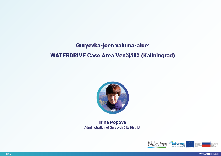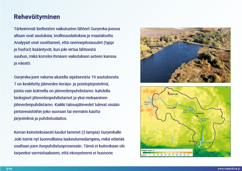 Guryevka-joki (Mühlen Fluss) on pieni joki Kaliningradin alueella, jonka pääasialliset saastelähteet ovat asutukset, teollisuuslaitokset ja maatalous. Waterdrive-projektin aikana suoritettiin vedenlaadun seurantaa, joka osoitti, että typpi- ja fosforipitoisuudet kasvavat joen virtauksen myötä lähteestä suulle. Esittelyssä esiteltiin tekokosteikkojen rakentamisen toteutettavuustutkimuksen tulokset sekä meneillään olevat meliorointijärjestelmän ennallistamiseen liittyvät toimet. Lukuisia konferensseja, kokouksia ja "pyöreän pöydän keskusteluja" pidettiin tietoisuuden lisäämiseksi nykyaikaisista maatalouden ympäristötoimenpiteistä.