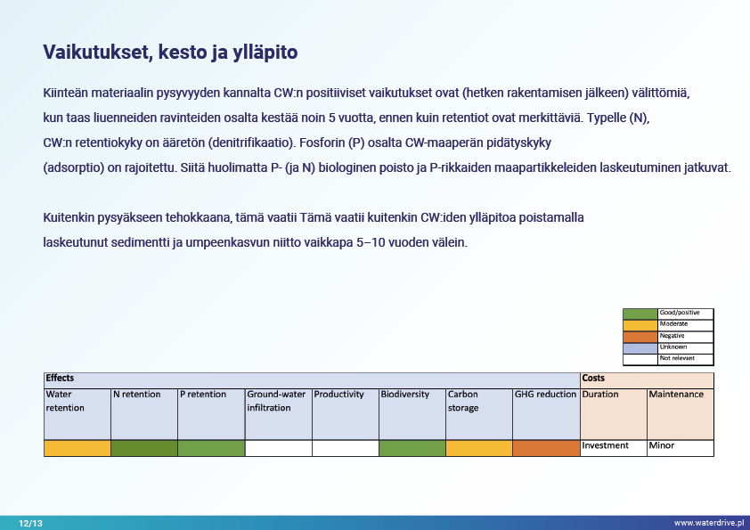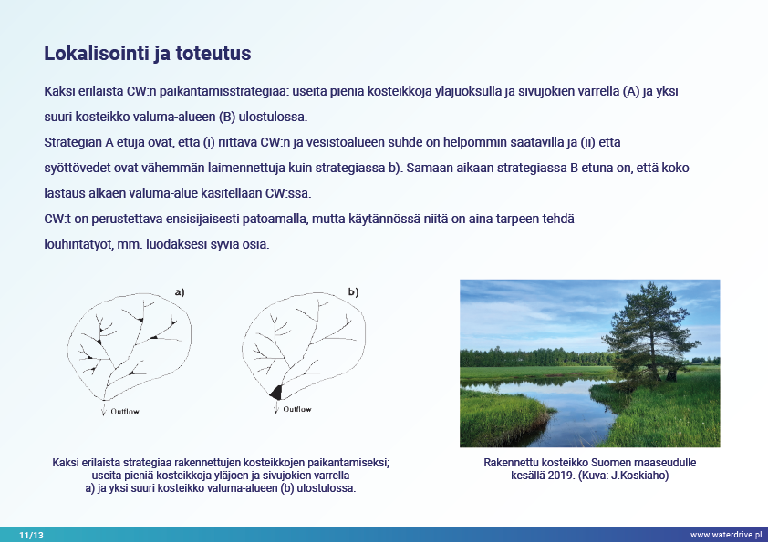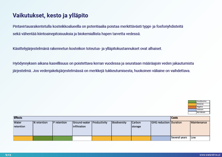 Myös keinotekoisten kosteikkojen rakentaminen, sekä pinta- että maanalainen virtaus, on ratkaisu, jolla on monia ympäristöhyötyjä. Ensinnäkin niillä on kyky vähentää saastumista, lisätä vedenpidätyskykyä ja luoda uusia elinympäristöjä, mikä lisää biologista monimuotoisuutta.