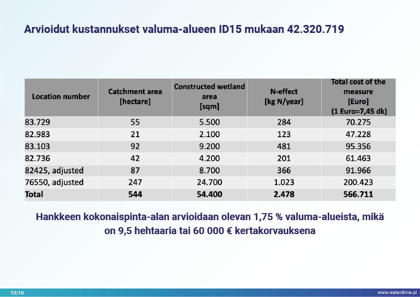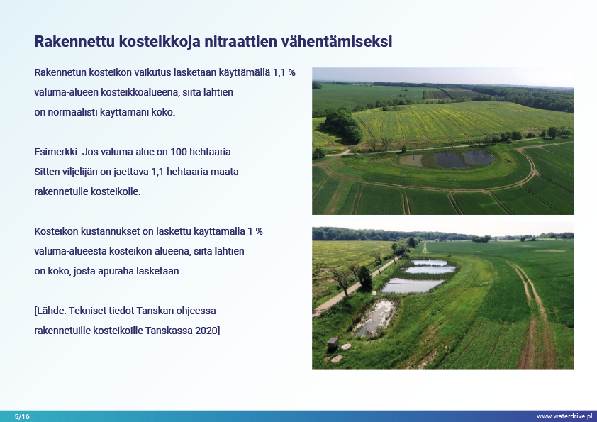 Ravinteiden valuma ei ole merkittävästi vähentynyt viimeisen 10 vuoden aikana Tanskassa, joten investoinnit tekokosteikkojen rakentamiseen on asetettu etusijalle lieventävinä toimenpiteinä. Tätä tarkoitusta varten on perustettu valuma-alueviranomaisia, jotka on johdettu maanviljelijöiden luottamista maatalousneuvojista ja joilla on tiedot ja työkalut rakennettujen kosteikkojen suunnittelua varten optimaaliseen paikkaan valuma-alueella.