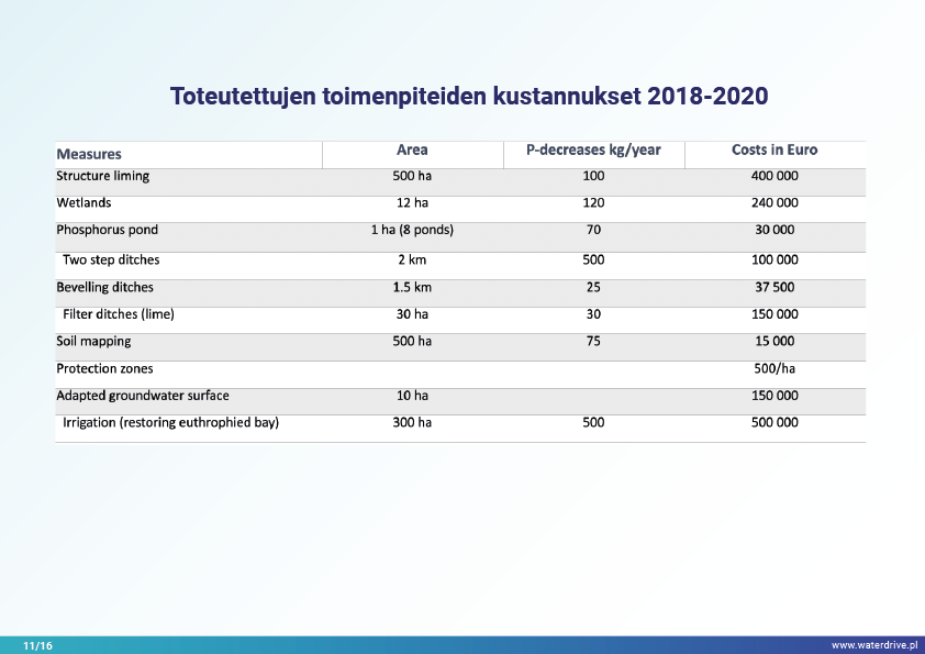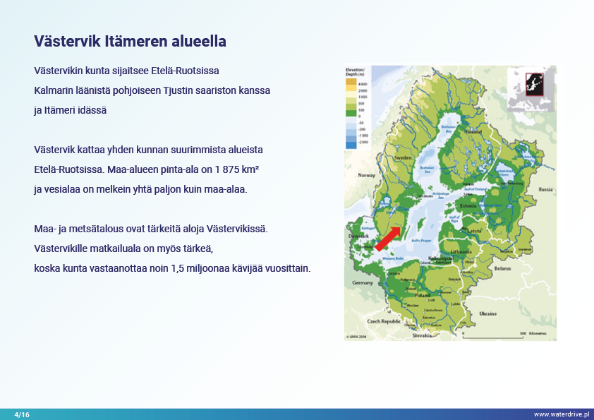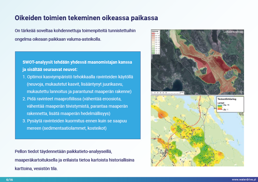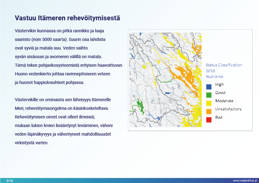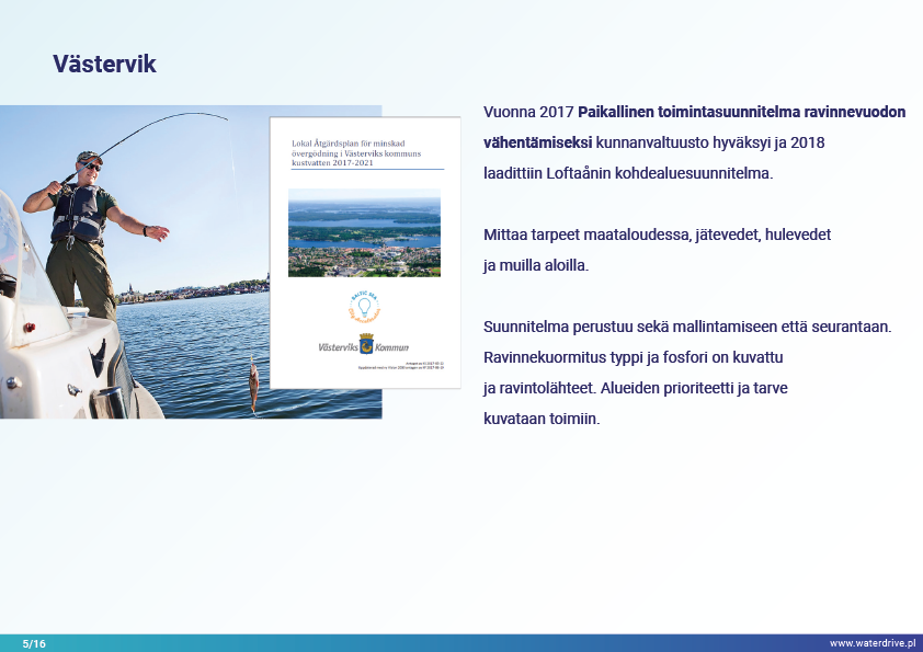 Västervikin kunnassa (Ruotsi) on pitkä rannikko ja laaja saaristo Itämerellä. Vuonna 2017 hyväksyttiin Paikallinen toimintasuunnitelma ravinnehäviöiden vähentämiseksi Itämeren rehevöitymisen vähentämiseksi. Suunnitelmassa yksilöidään useita lieventäviä toimenpiteitä, joita tulisi soveltaa maatalousalueilla (esim. rakenteellinen kalkitus, suodatusojat, kaksivaiheiset ojat, fosforilammet, kosteikot ja valvottu kuivatus). Toimenpiteet sovitettiin tunnistettuun ongelmaan ja niiden sijainti valittiin optimaaliseksi valuma-alueella.
