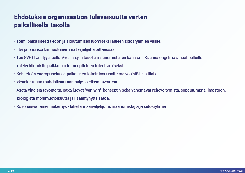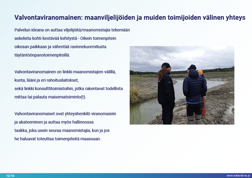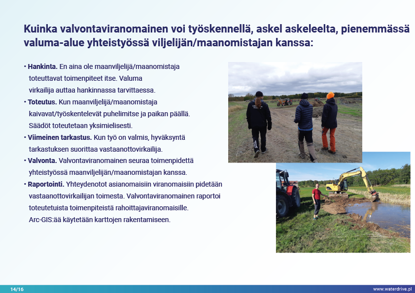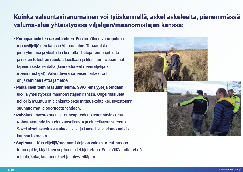 Ajatus "Tekee oikeita asioita oikeassa paikassa" inspiroi kaikkia Waterdrive-projektin kumppaneita. Esitellään kokemuksia vedenpitäjän työstä yhteistyössä maanviljelijöiden ja maanomistajien kanssa toimintasuunnitelman toteuttamisessa.