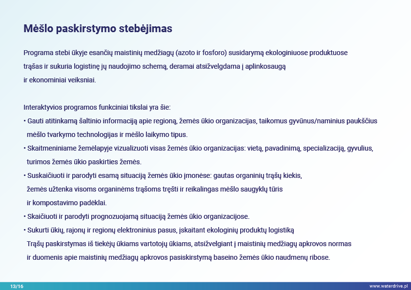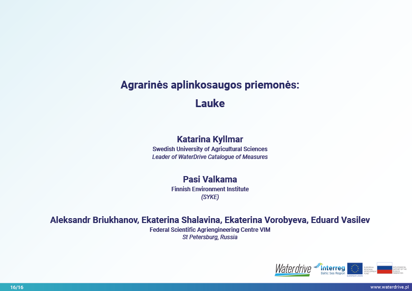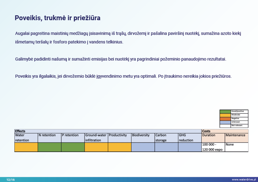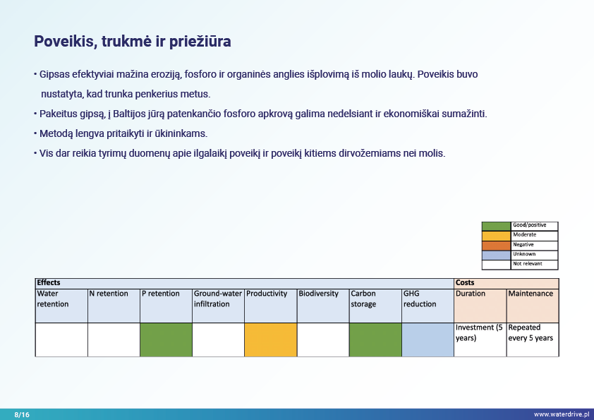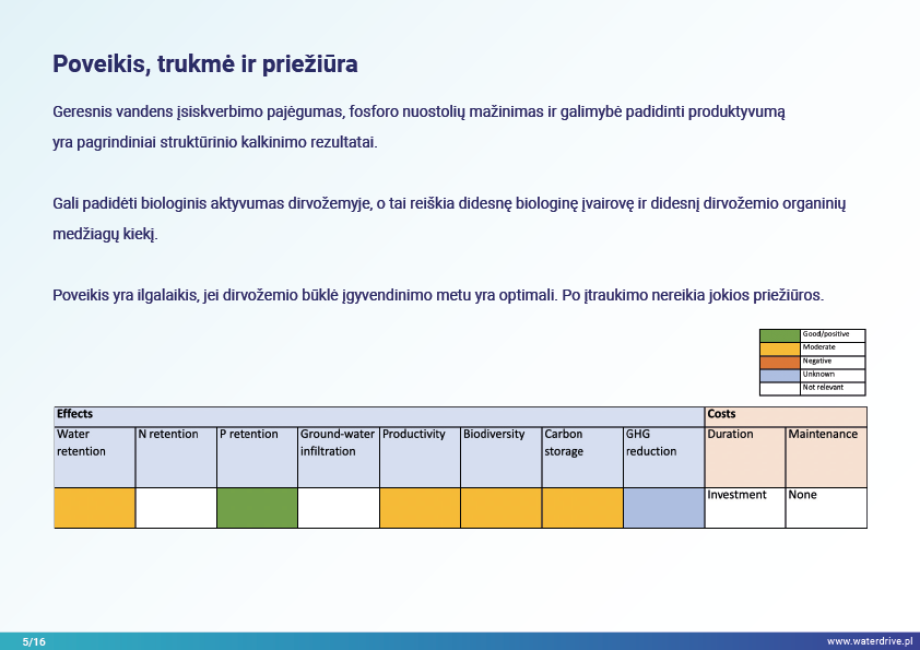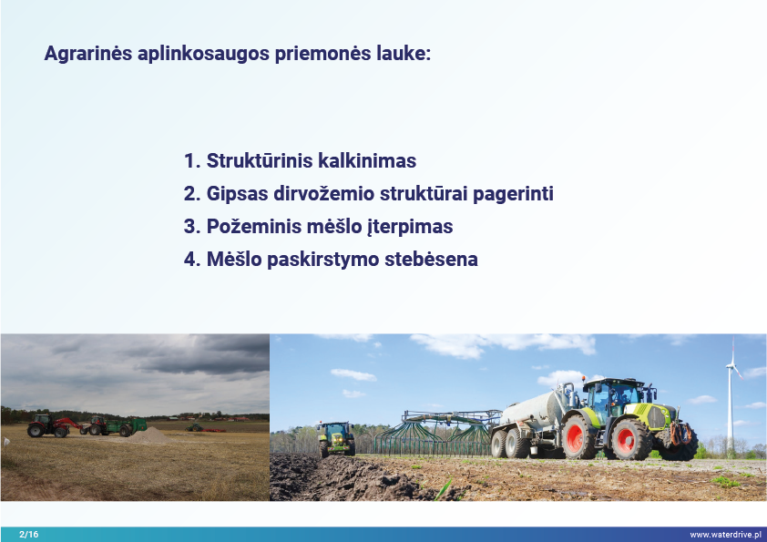 Waterdrive priemonių kataloge (https://www.slu.se/waterdrive) buvo pasirinktos dvi dirvožemio struktūros gerinimo priemonės: struktūrinis kalkinimas ir gipso įterpimas, mažinantis dirvožemio eroziją. Kitos dvi pateiktos priemonės – mėšlo naudojimas po žeme ir mėšlo paskleidimo baseino mastu stebėjimas – rodo tvaraus mėšlo paskleidimo potencialą, padedantį sumažinti vandens taršą.