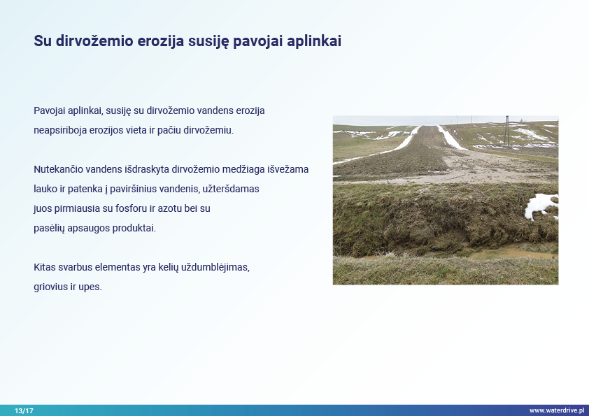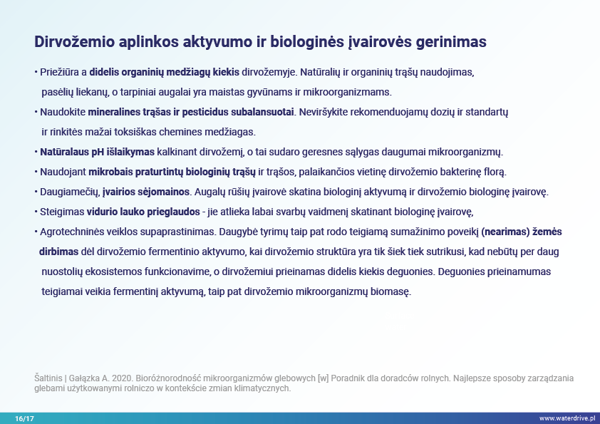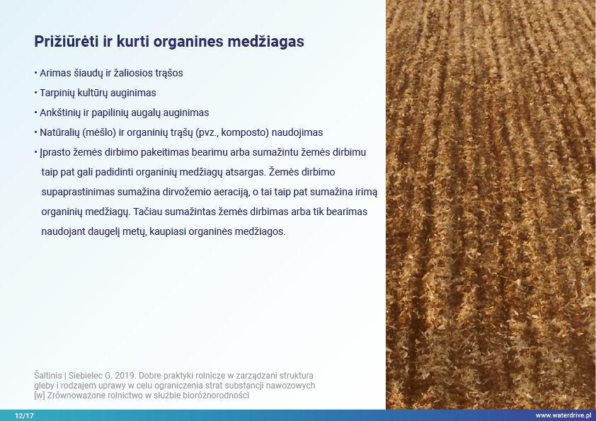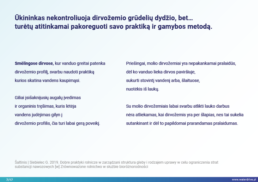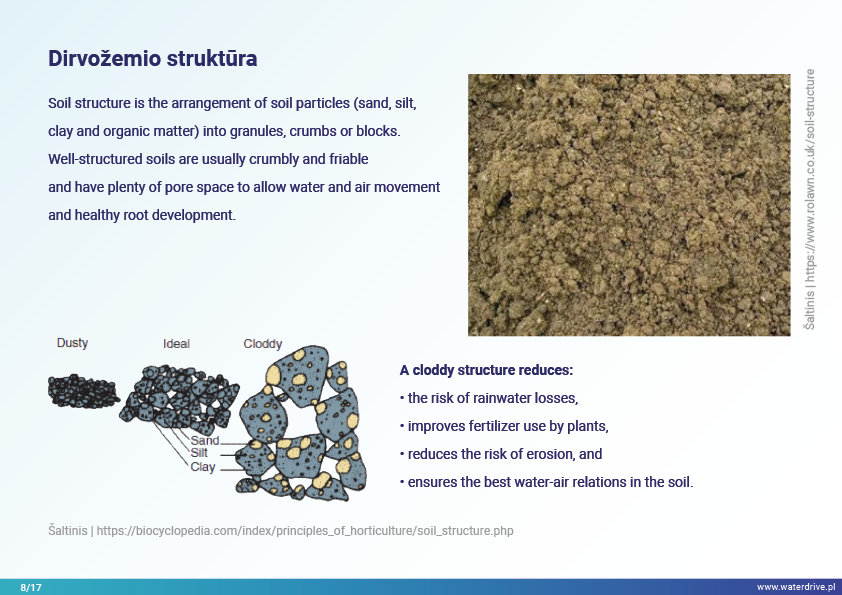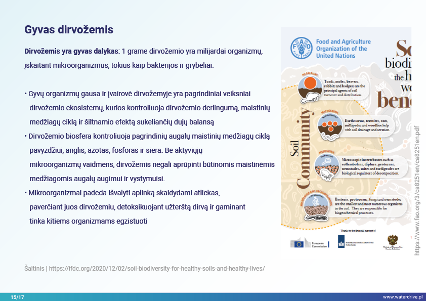 Šiame pristatyme mes sutelkiame dėmesį į dirvožemio vaidmenį sulaikant vandenį ir taip užkertant kelią maistinių medžiagų praradimui. Mes parodome, kokia gera žemės ūkio praktika padeda rūpintis dirvožemio struktūra, didinti organinių medžiagų kiekį dirvožemyje ir riboti dirvožemio eroziją