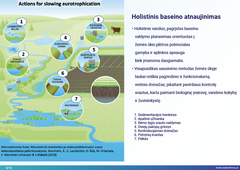 Holistinio vandens valdymo įgyvendinimas baseino mastu tikriausiai garantuoja geriausią įmanomą rezultatą tiek drenažui, tiek dirvožemio struktūrai gerinti, ir maistinių medžiagų nuostolių vandens telkiniams sumažinimą, atsižvelgiant į biologinę įvairovę, vandens kokybę ir žuvininkystę.
