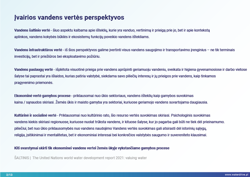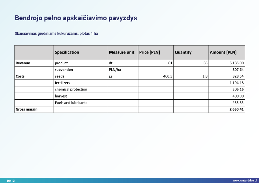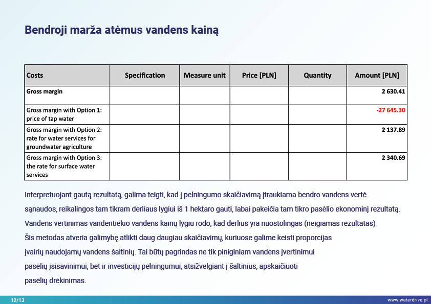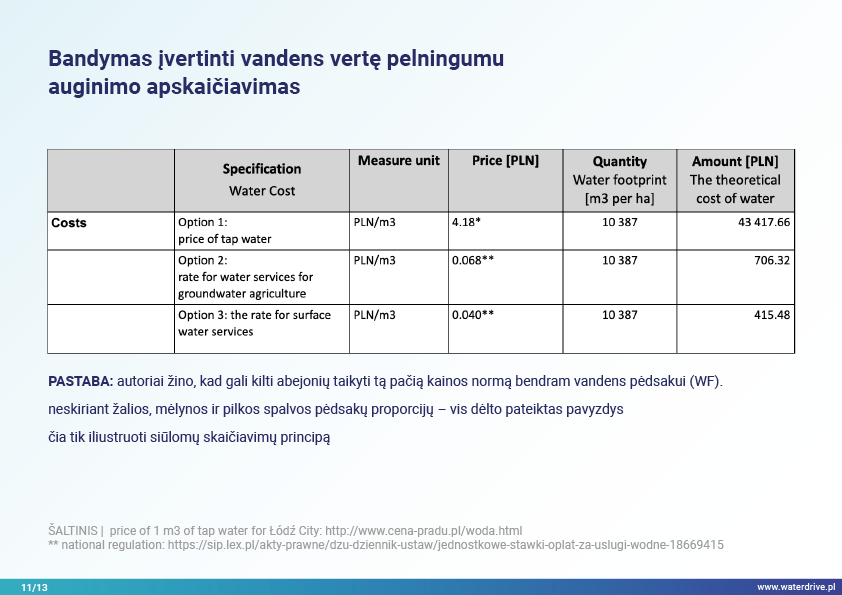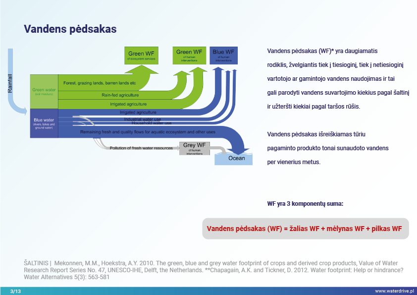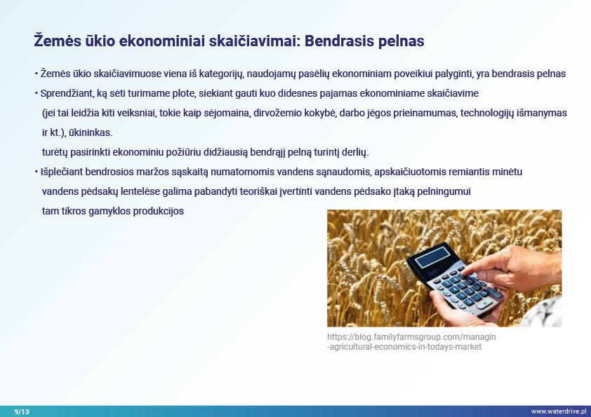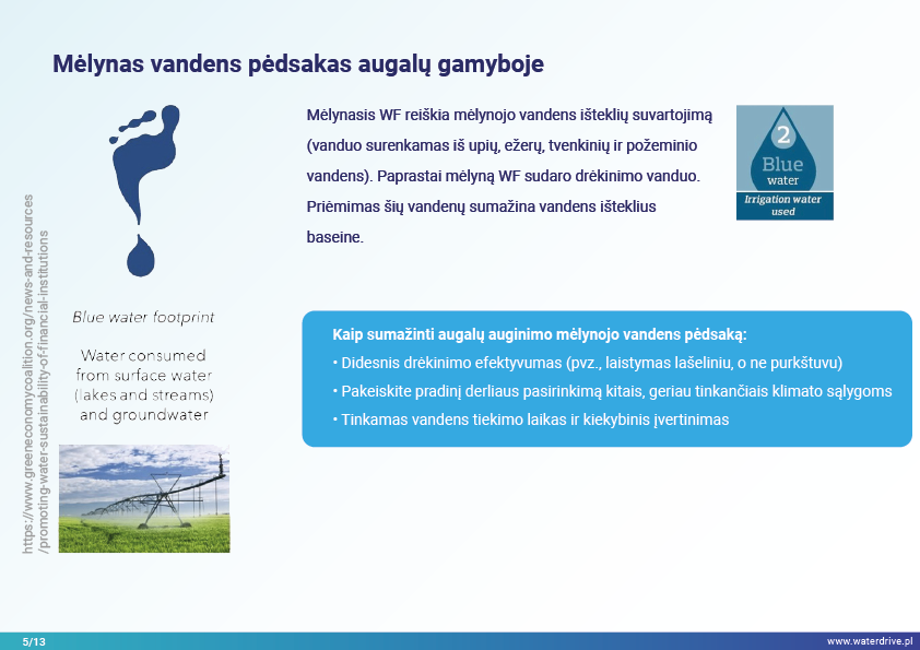 Pristatyme identifikuojame galimybes sumažinti augalininkystės vandens pėdsaką žaliuoju (lietaus vandens naudojimas), mėlynuoju (vanduo, paimamas iš paviršinio ir požeminio vandens drėkinimui) ir pilkojo vandens pėdsaku (vanduo, naudojamas žemės ūkio teršalams skiesti). Be to, buvo pasiūlytas būdas įtraukti žemės ūkio vandenį į ekonominius skaičiavimus, išplečiant tiesioginio pertekliaus sąskaitą, įtraukiant apskaičiuotas vandens sąnaudas.