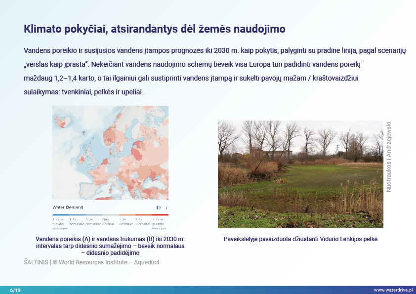 Vandentvarkos srityje susiduriame su tik trimis, bet gana kritiniais iššūkiais – vandens per mažai, per daug arba jis užterštas. Šios problemos dažniausiai yra tarpusavyje susijusios, todėl išsprendus vieną, galiausiai galima pagilinti kitą (pvz., apsauga nuo potvynių miestuose, pagrįsta efektyviu vandens nutekėjimu, kas prisideda prie UHI ir požeminio vandens lygio kritimo). Vandens trūkumas arba perteklius atsiranda vėliau dėl sezoninių kritulių pokyčių, vandens paskirstymo ir naudojimo intensyvumo problemų. Vandens trūkumas daro įtaką dirvožemio struktūrai, todėl jis tampa mažiau pralaidus, sukelia vėjo eroziją, blogina ekosistemas, veikiančias kaip vandens saugyklos: upes, ežerus, tvenkinius, pelkes, miškus ir didina taršos koncentraciją vandens telkiniuose. Vandens išsiliejimas sukelia vandens eroziją, išplovimo taršą, hidraulinį poveikį upėms. Didėjant klimato kaitai ir intensyvėjant vandens naudojimui žemės ūkyje, šie procesai artimiausiais dešimtmečiais greičiausiai sustiprės.