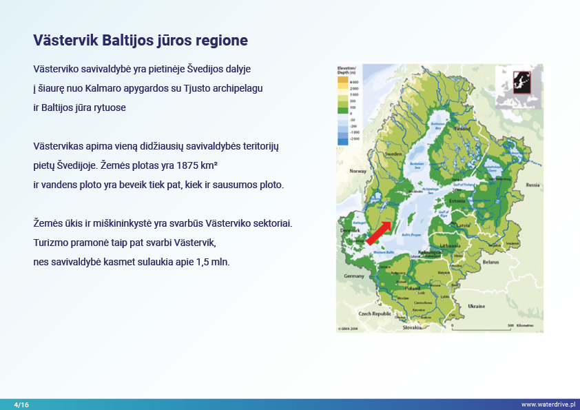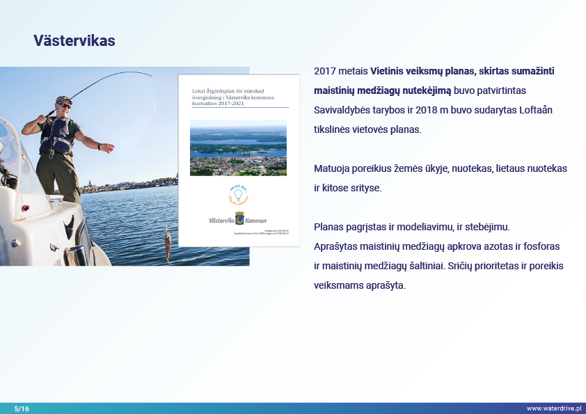 Västerviko (Švedija) savivaldybė Baltijos jūroje turi ilgą pakrantę ir didelį archipelagą. 2017 metais buvo patvirtintas Vietos veiksmų planas maistinių medžiagų nuostoliams mažinti, siekiant sumažinti Baltijos jūros eutrofikaciją. Plane nurodytos kelios mažinimo priemonės, kurios turėtų būti taikomos žemės ūkio paskirties vietovėse (pvz., struktūrinis kalkinimas, filtraciniai grioviai, dviejų pakopų grioviai, fosforo tvenkiniai, pelkės ir kontroliuojamas drenažas). Priemonės buvo suderintos su nustatyta problema, o jų vieta baseine parinkta kaip optimali.
