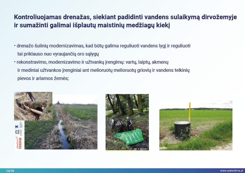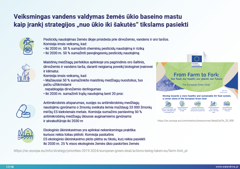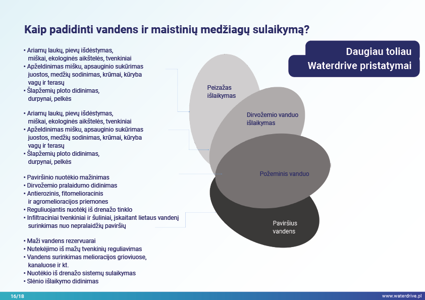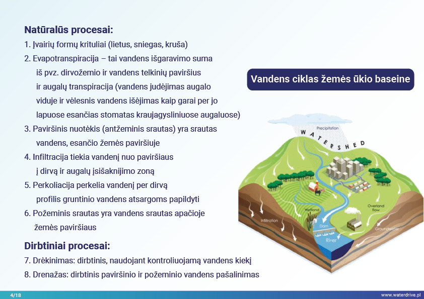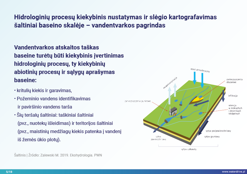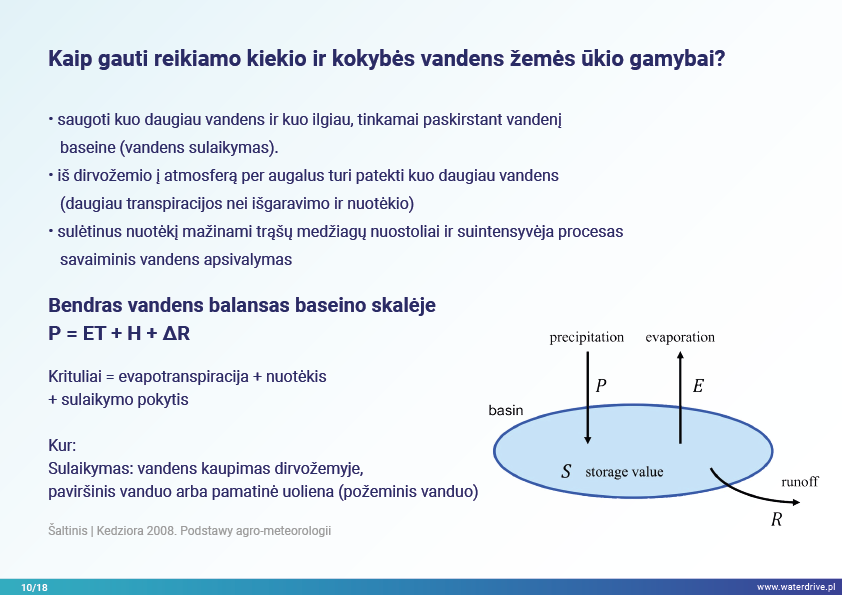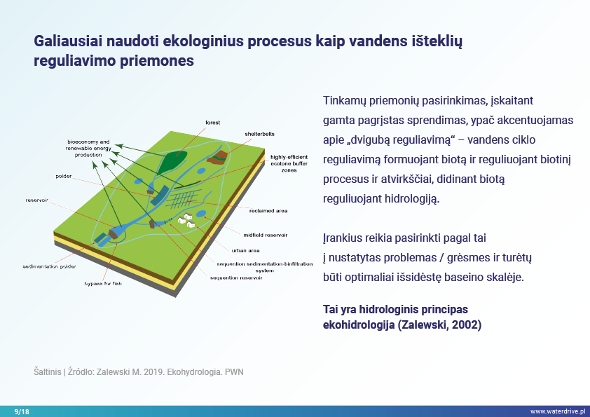 Šiame pristatyme paaiškiname baseino (upės baseino) sąvoką ir įvairius vandens ciklą sudarančius procesus. Taip pat pristatome tris vandentvarkos etapus, pagrįstus ekohidrologijos principais (Zalewski 2002), kuri prisiima „dvigubą reguliavimą“ – vandens ciklo reguliavimą formuojant biotą ir reguliuojant biotinius procesus ir atvirkščiai, biotos stiprinimą reguliuojant hidrologiją. Pateikta geroji praktika parodo, kaip galime daryti įtaką vandens sulaikymo didinimui ir maistinių medžiagų nuotėkio mažinimui kraštovaizdyje, dirvožemyje, drenažo sistemoje, paviršinio vandens ir sekliojo gruntinio vandens lygiuose. Tai kvietimas daugiau pristatymų!