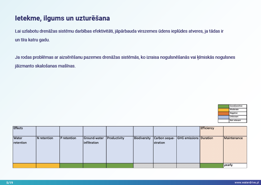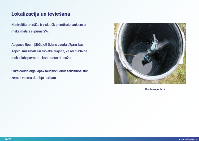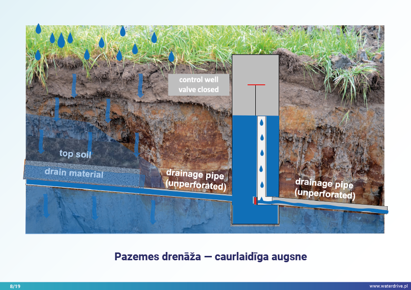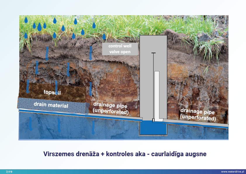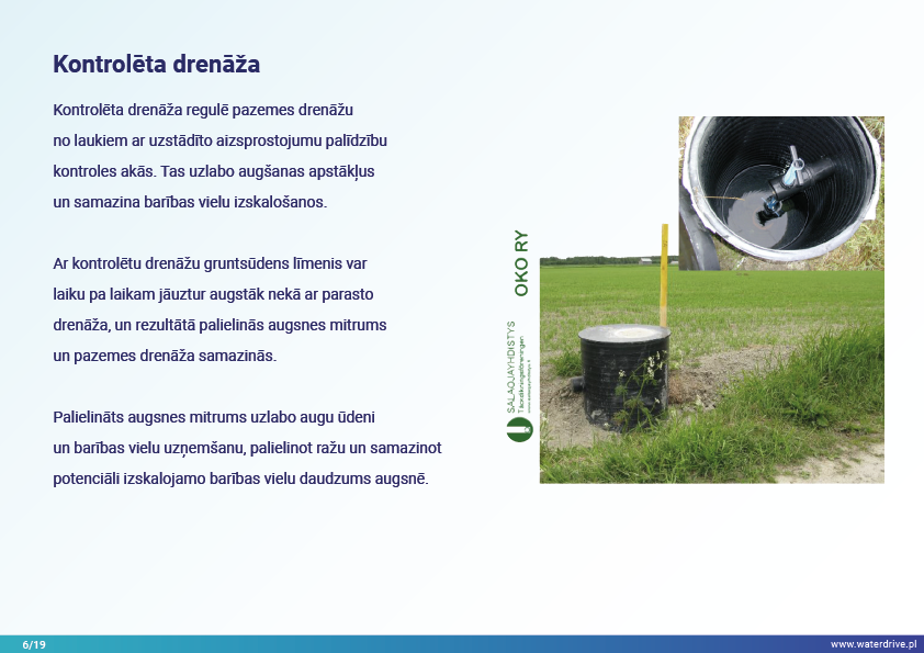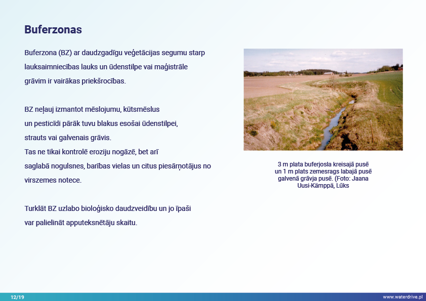 Vēl viena agrovides pasākumu grupa, kas sniegta Waterdrive pasākumu katalogā (https://www.slu.se/waterdrive), ir pasākumi zemes un ūdens saskarnē. Pirmie divi attiecas uz drenāžas sistēmas darbību: meliorācijas sistēmu atjaunošana un kontrolēta drenāžas sistēma, kas ļauj kontrolēt ūdens plūsmu un samazināt barības vielu izskalošanos. Buferjoslu un palieņu izmantošana ir vairāku labumu pasākums, piem. saglabā nogulsnes, barības vielas un citus piesārņotājus un uzlabo bioloģisko daudzveidību.
