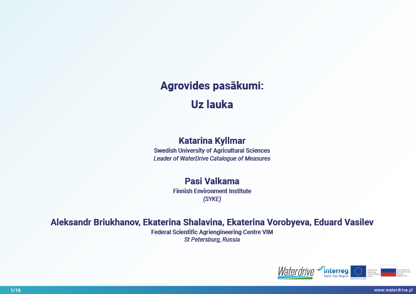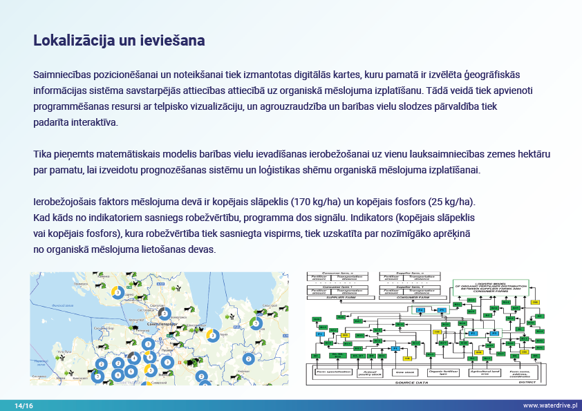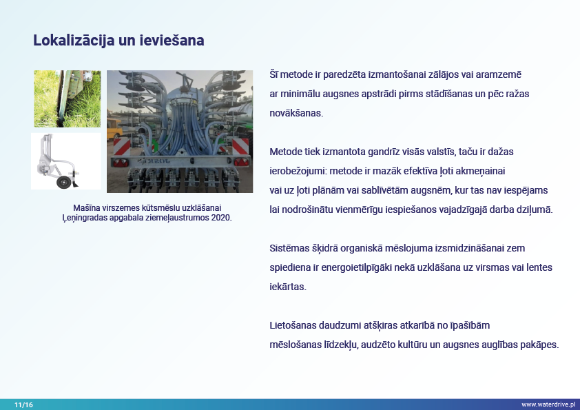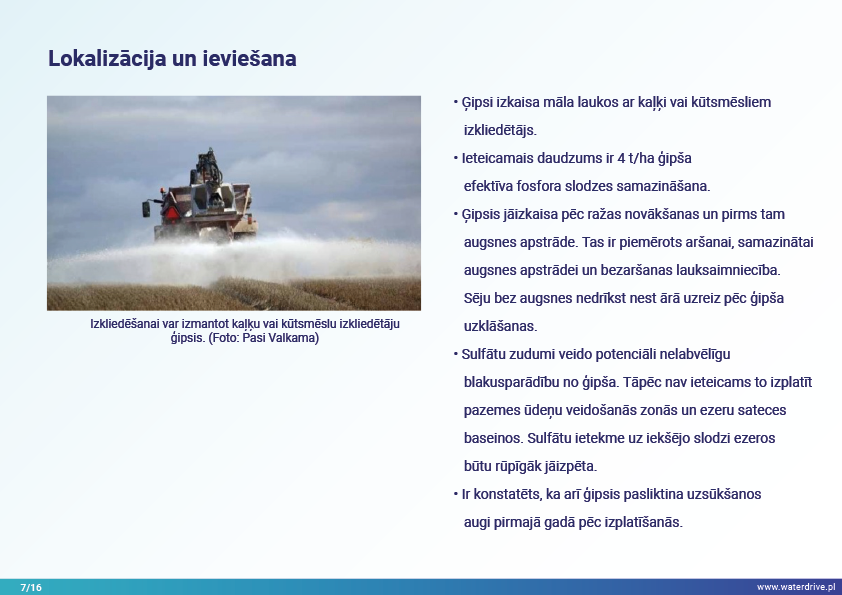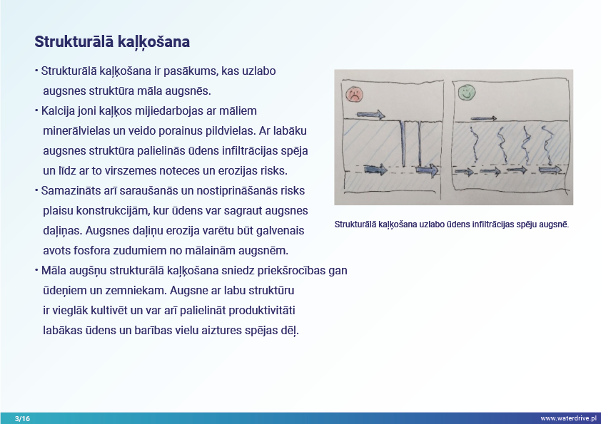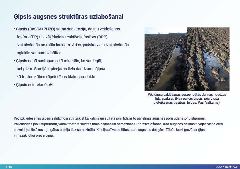 Waterdrive pasākumu katalogā (https://www.slu.se/waterdrive) augsnes struktūras uzlabošanai tika izvēlēti divi pasākumi: strukturālā kaļķošana un ģipša uzklāšana, kas samazina augsnes eroziju. Nākamie divi iesniegtie pasākumi, kūtsmēslu izmantošana pazemē un kūtsmēslu lietošanas uzraudzība sateces baseina mērogā, norāda uz ilgtspējīgas kūtsmēslu lietošanas potenciālu, lai palīdzētu samazināt ūdens piesārņojumu.