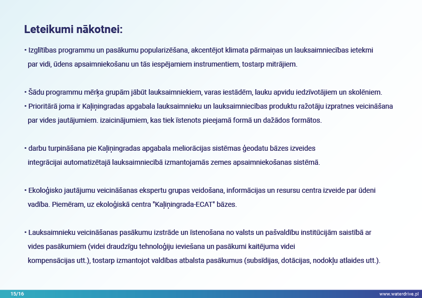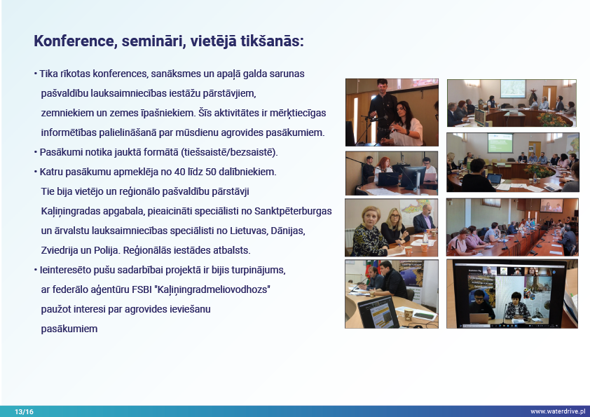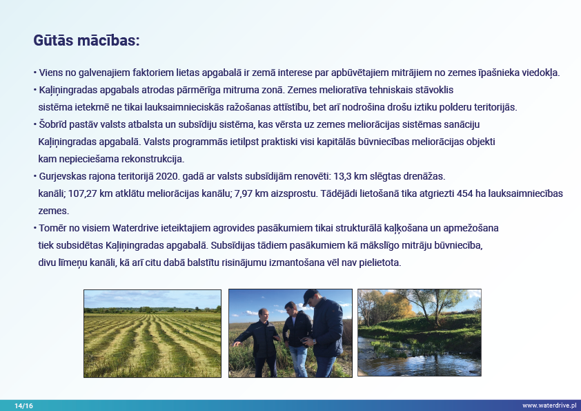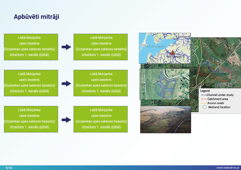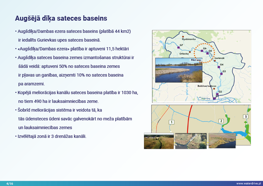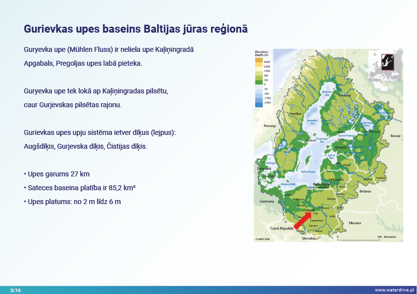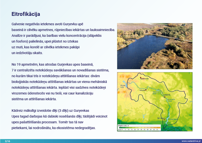 Guryevka upe (Mühlen Fluss) ir neliela upe Kaļiņingradas apgabalā, kuras galvenie piesārņojuma avoti ir cilvēku apmetnes, rūpniecības uzņēmumi un lauksaimniecība. Waterdrive projekta laikā tika veikts ūdens kvalitātes monitorings, kas parādīja, ka slāpekļa un fosfora koncentrācija palielinās, upei plūstot no iztekas līdz grīvai. Tika prezentēti mākslīgo mitrāju būvniecības priekšizpētes rezultāti, kā arī notiekošās aktivitātes saistībā ar meliorācijas sistēmas atjaunošanu. Lai veicinātu izpratni par mūsdienu agrovides pasākumiem, tika rīkotas daudzas konferences, sanāksmes un "apaļie galdi".