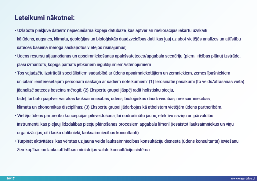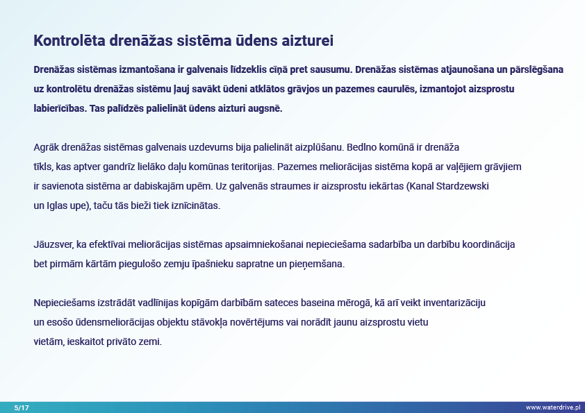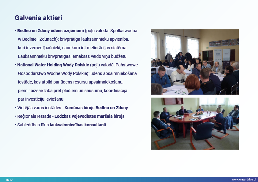 Mēs iepazīstinām ar progresu vietējā daudzu ieinteresēto personu sadarbībā, lai palielinātu ūdens aizturi, kurā galvenie dalībnieki ir ūdens uzņēmumi (brīvprātīga lauksaimnieku apvienība) un National Water Holding Wody Polskie. Reģionālās un nacionālās iniciatīvas ir spēcīgi veicinājušas vietējās darbības.