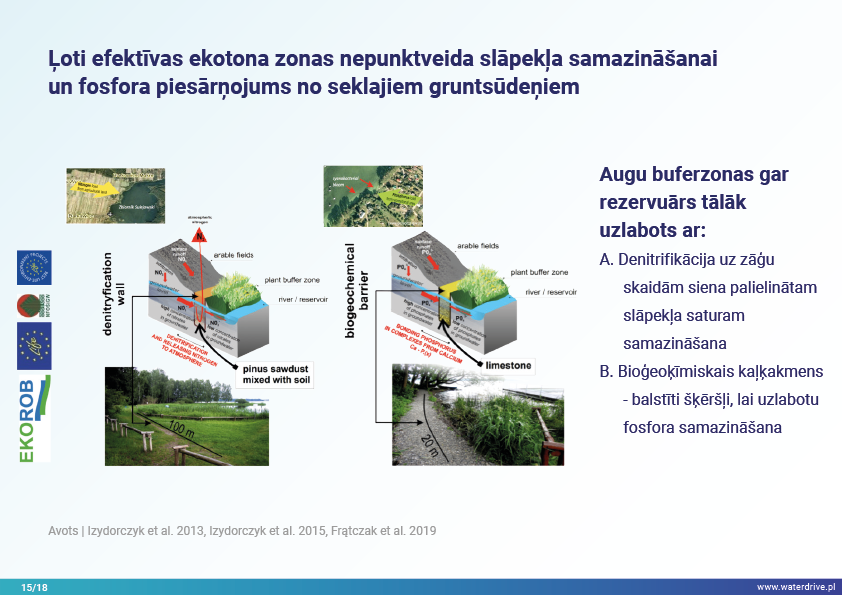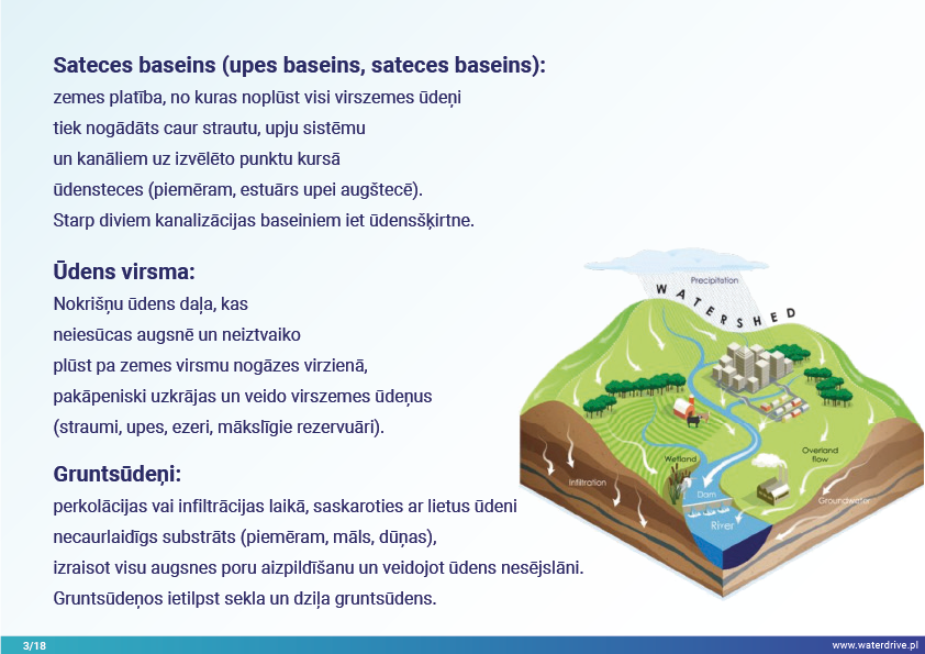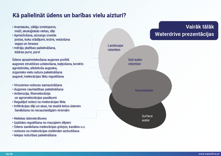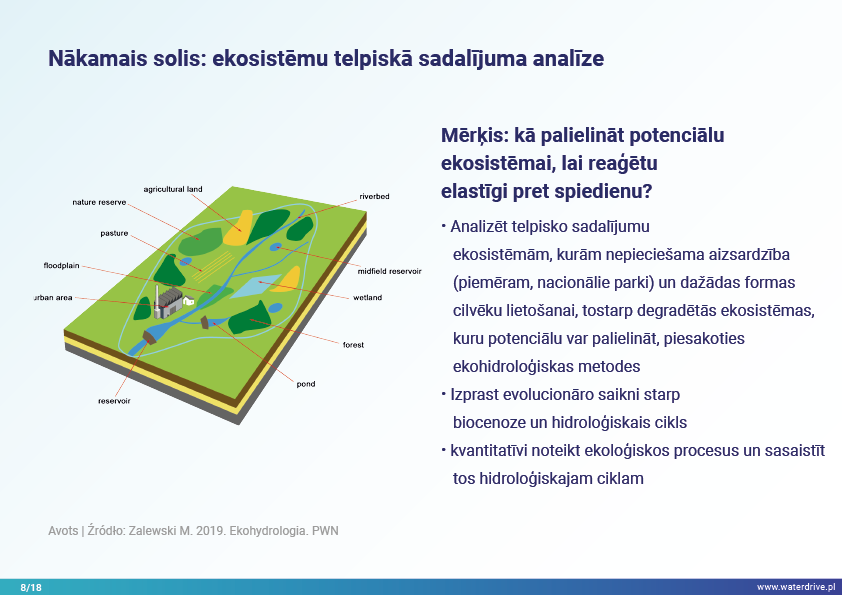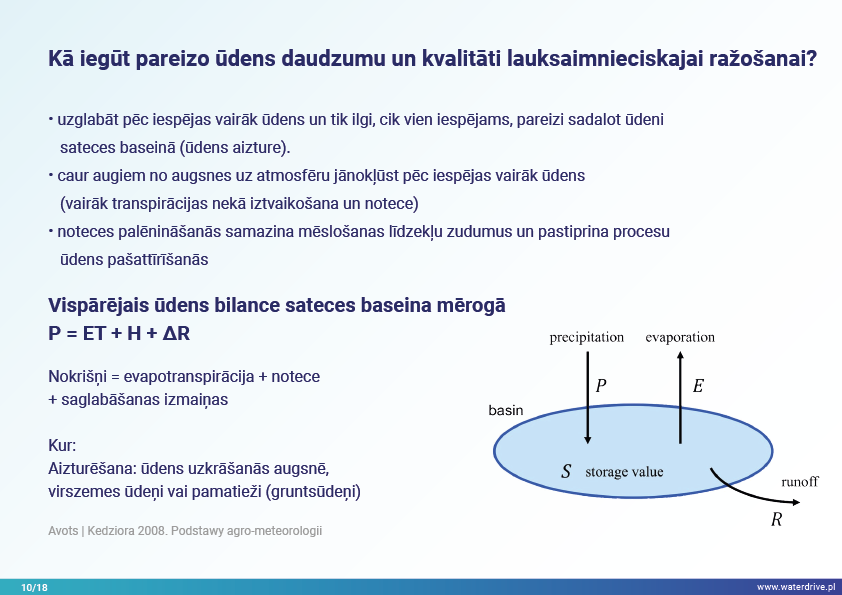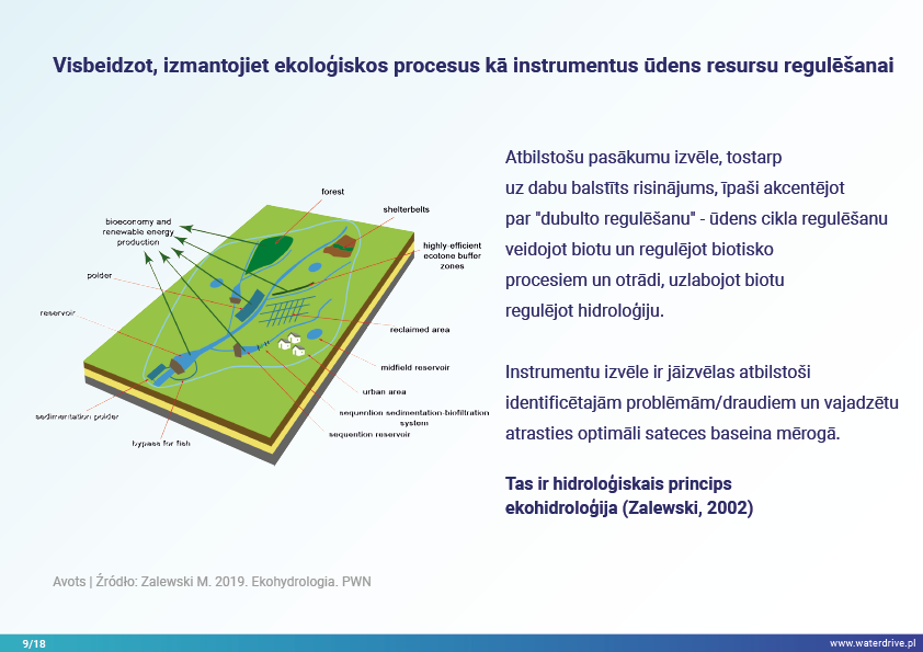 Šajā prezentācijā mēs izskaidrojam sateces baseina (upes baseina) jēdzienu, kā arī dažādus procesus, kas veido ūdens ciklu. Mēs piedāvājam arī trīs soļus ūdens apsaimniekošanā, kas balstās uz ekohidroloģijas principiem (Zalewski 2002), kas paredz "duālo regulēšanu" - ūdens cikla regulēšanu, veidojot biotu un regulējot biotiskos procesus, un otrādi, uzlabojot biotu, regulējot hidroloģiju. Iesniegtā labā prakse parāda, kā varam ietekmēt ūdens aiztures palielināšanos un barības vielu noteces samazināšanos ainavā, augsnē, meliorācijas sistēmā, virszemes ūdeņos un seklā gruntsūdeņu līmenī. Šis ir aicinājums uz vairākām prezentācijām!