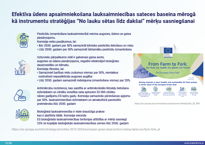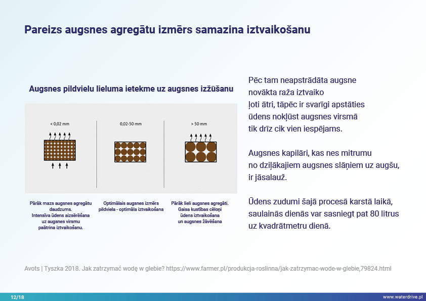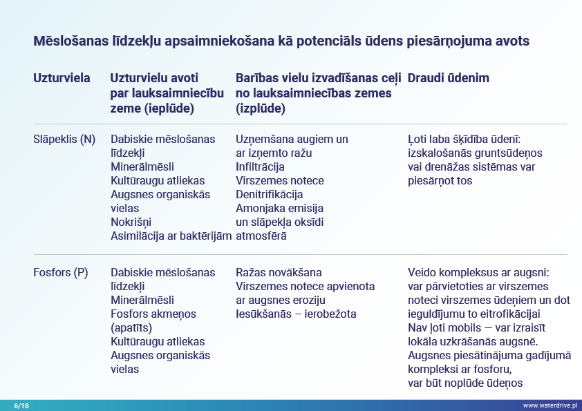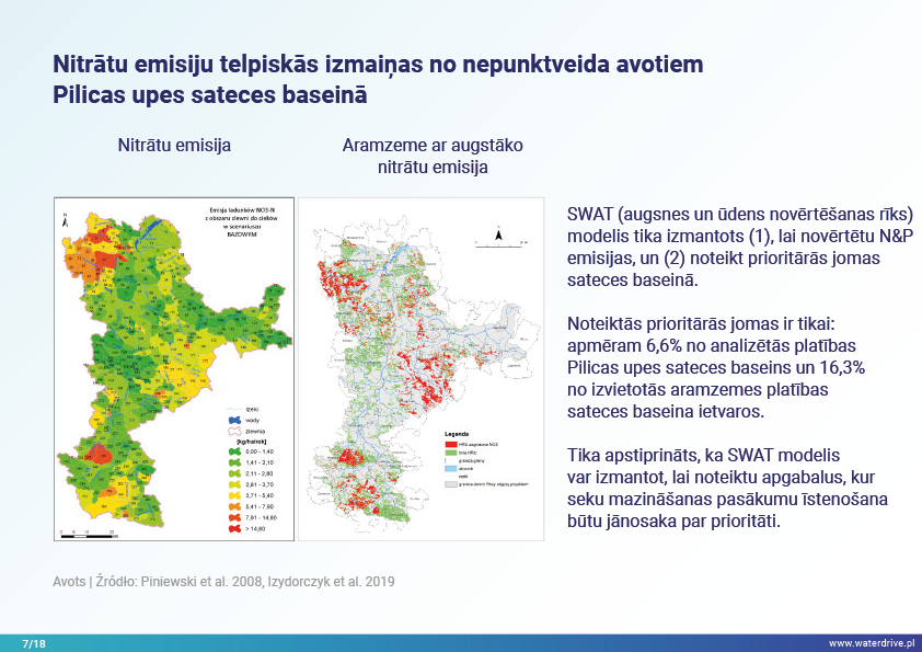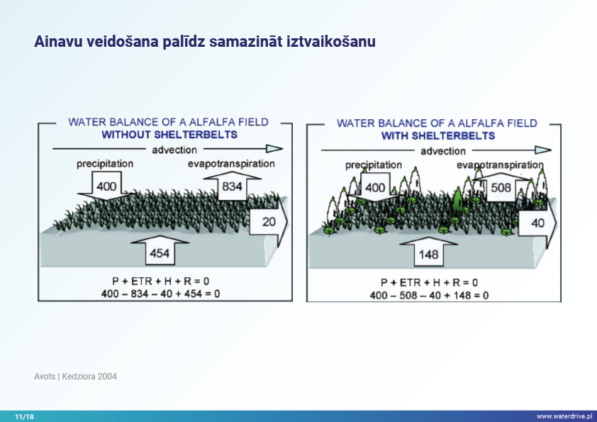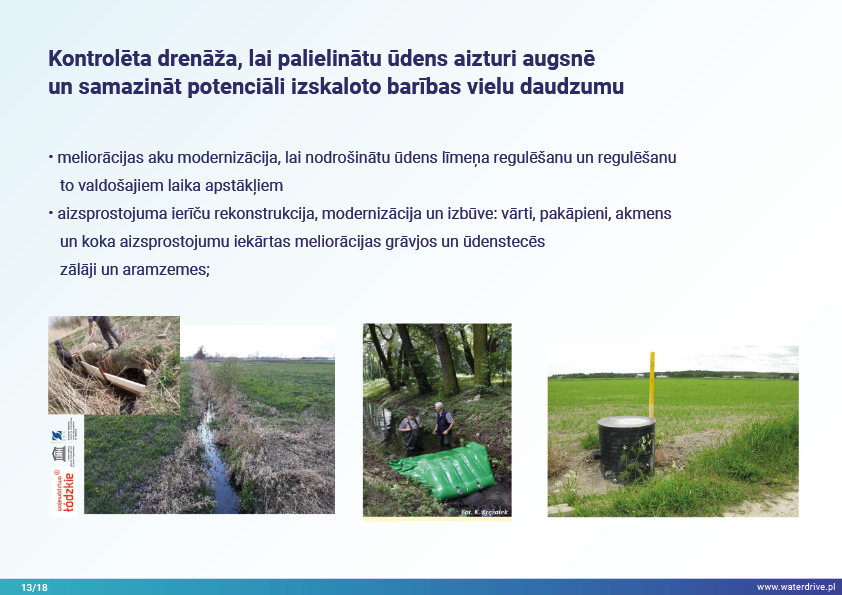 Šajā prezentācijā mēs izskaidrojam sateces baseina (upes baseina) jēdzienu, kā arī dažādus procesus, kas veido ūdens ciklu. Mēs piedāvājam arī trīs soļus ūdens apsaimniekošanā, kas balstās uz ekohidroloģijas principiem (Zalewski 2002), kas paredz "duālo regulēšanu" - ūdens cikla regulēšanu, veidojot biotu un regulējot biotiskos procesus, un otrādi, uzlabojot biotu, regulējot hidroloģiju. Iesniegtā labā prakse parāda, kā varam ietekmēt ūdens aiztures palielināšanos un barības vielu noteces samazināšanos ainavā, augsnē, meliorācijas sistēmā, virszemes ūdeņos un seklā gruntsūdeņu līmenī. Šis ir aicinājums uz vairākām prezentācijām!
