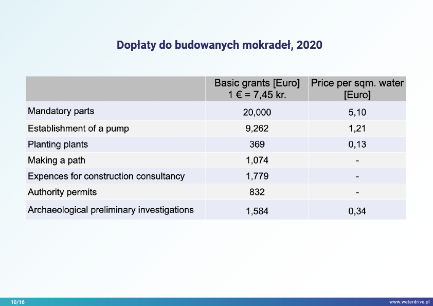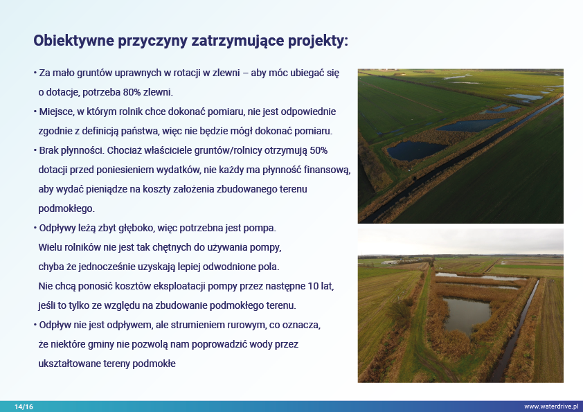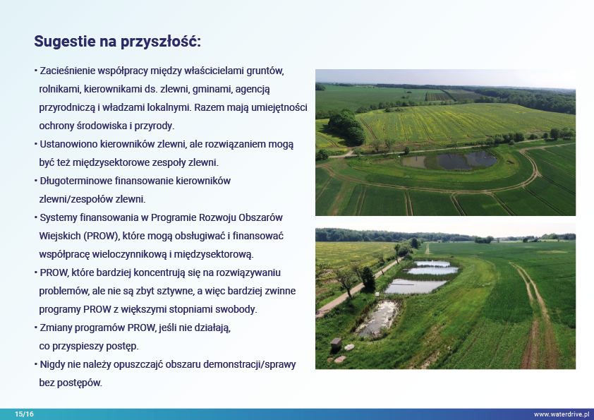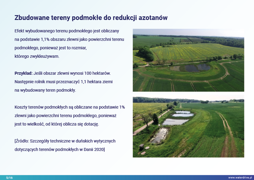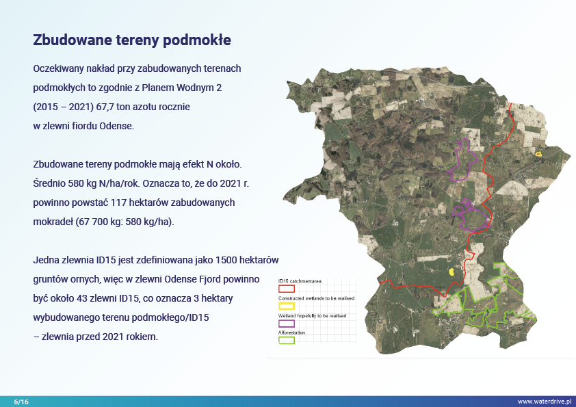 Wypłukiwanie związków biogenicznych nie zmniejszyło się znacznie w ciągu ostatnich 10 lat w Danii, dlatego postawiono na inwestycje w budowę sztucznych mokradeł jako na efektywne działanie naprawcze. W tym celu ustanowiono oficerów zlewniowych - wywodzących się z doradców rolnych cieszących się zaufaniem rolników, wyposażonych w dane i narzędzia do planowania sztucznych mokradeł w optymalnej lokalizacji w zlewni.