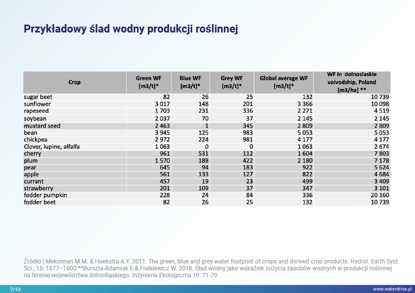 W prezentacji wskazujemy na możliwości zmniejszenia śladu wodnego w produkcji roślinnej w podziale na zielony (wykorzystanie wody opadowej), niebieski (woda czerpana z wód powierzchniowych i gruntowych do nawodnień) oraz szary ślad wodny (woda wykorzystana do rozcieńczenia rolniczych zanieczyszczeń). Ponadto został zaproponowany sposób uwzględnienia wody w rolnictwie w kalkulacjach ekonomicznych poszerzając rachunek nadwyżki bezpośredniej o szacunkowy koszt wody.