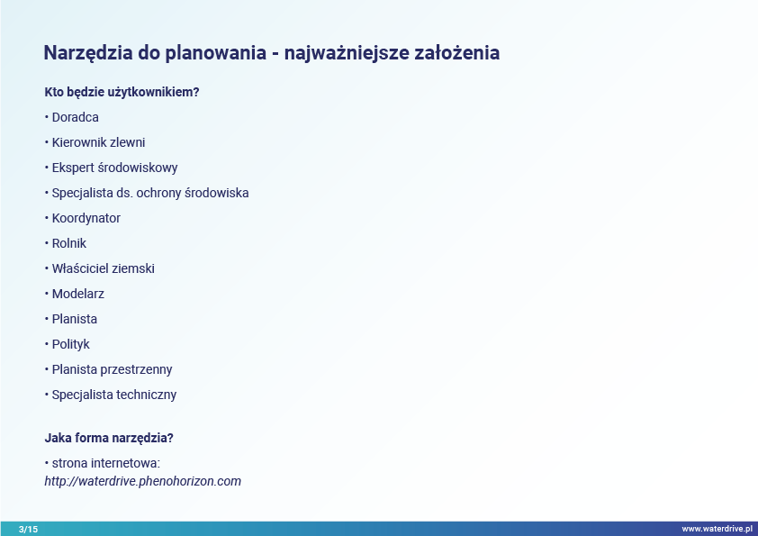 Planning Toolbox (https://waterdrive.cdr.gov.pl) to ogólnodostępny serwis internetowy, z którego można dowiedzieć się o dobrych praktykach planowania przestrzennego, jakich narzędzi używać, jak sięgać głębiej i kogo angażować w ten proces, aby osiągnąć pożądane efekty środowiskowe przy jednoczesnym zaspokojeniu potrzeb społecznych.