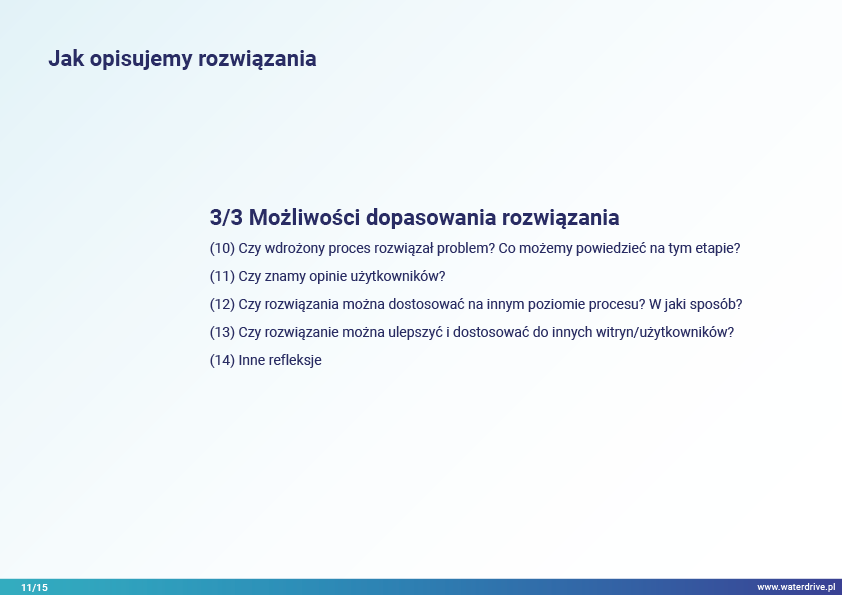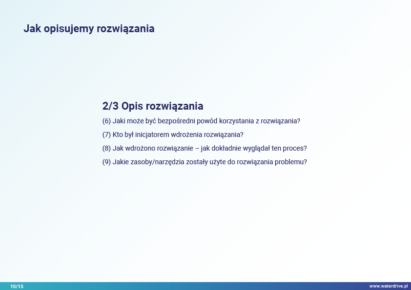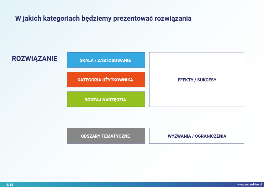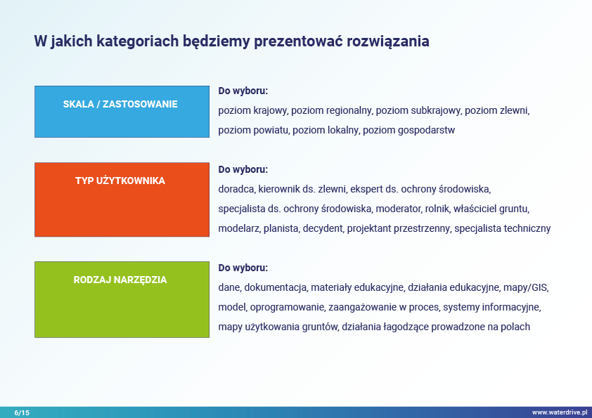 Rozwiązania oparte są na przykładach i obejmują różne obszary tematyczne w procesie planowania przestrzennego na gruntach rolnych w kontekście osiągania oczekiwanych wskaźników środowiskowych związanych z gospodarką wodną.