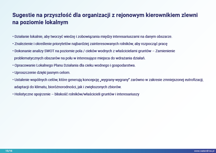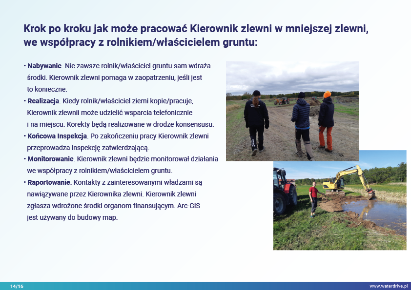 Działania dobrano do zidentyfikowanego problemu, a ich lokalizację wybrano jako optymalną w zlewni. Idea „Właściwe rzeczy we właściwym miejscu” inspiruje wszystkich partnerów projektu Waterdrive. Przedstawiono doświadczenia z pracy doradcy zlewniowego/wodnego we współpracy z rolnikami i właścicielami gruntów przy wdrażaniu planu działań.