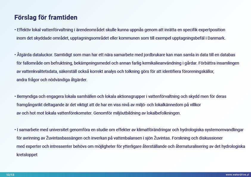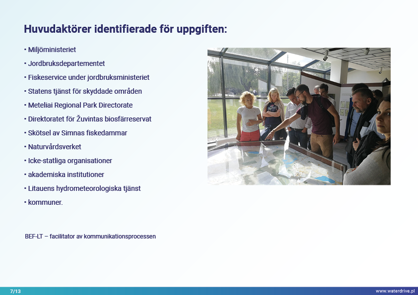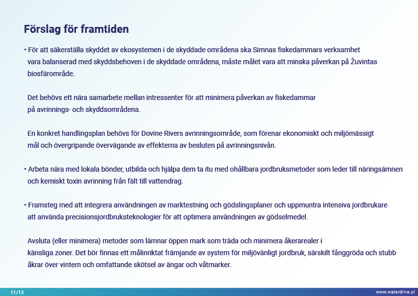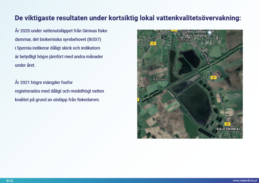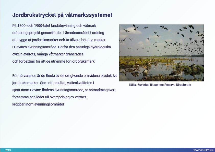 Dovinės avrinningsområde (Litauen) är ett unikt område eftersom inom avrinningsområdets gränser ligger två skyddade områden – Meteliai Regional Park och Žuvintas biosfärreservat. Under 1800- och 1900-talet genomfördes markåtervinnings- och våtmarksavvattningsprojekt i ärendeområdet i syfte att bygga ut jordbruksmarker. Analysen av kortsiktig lokal vattenkvalitetsövervakning visar bland annat fiskdammars inverkan på vattenkvaliteten. Vi presenterar också lärdomar från den lokala samarbetsinitieringsfasen.