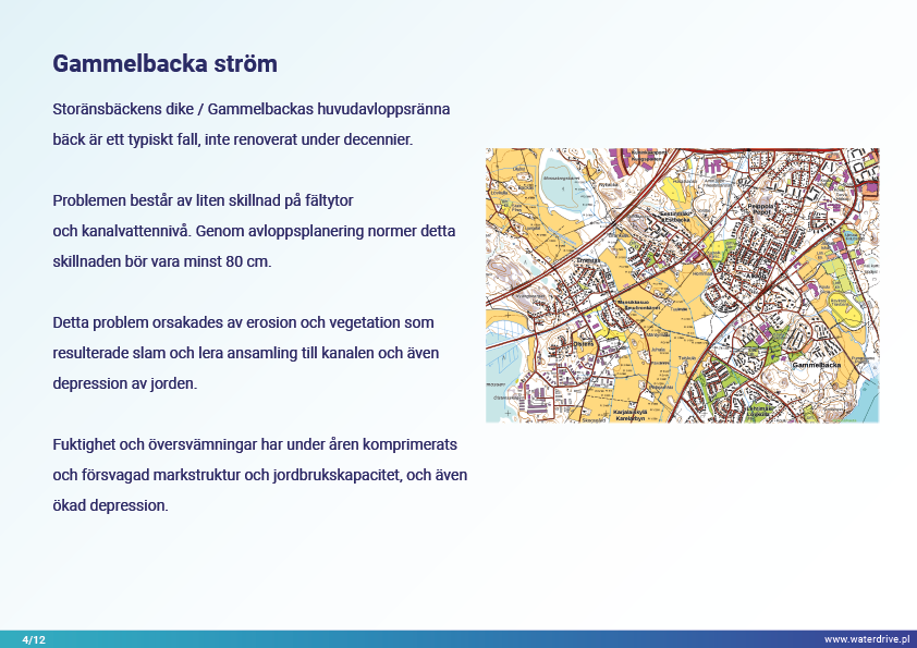 Huvudavloppsrännan i Storänsbäckens dike / Gammelbacka ström (Finlandia) är ett typiskt fall som inte renoverats under decennier. Huvudkanalens dåliga tillstånd komplicerade böndernas arbete, eftersom översvämningar och väta försenade sådd, försvårade skörden, minskade skördarna och förstörde markstrukturen.