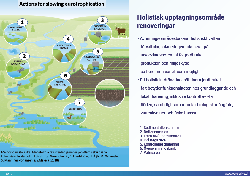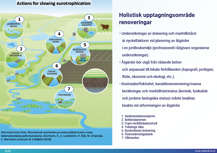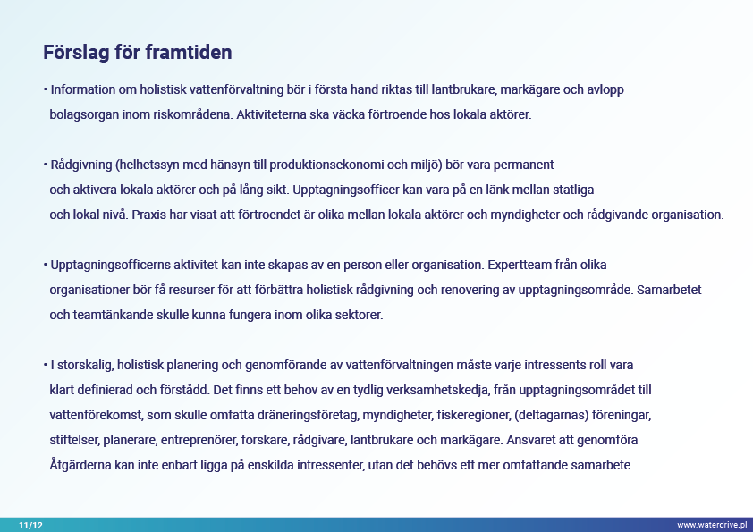 Implementering i avrinningsskala av holistisk vattenförvaltning garanterar sannolikt bästa möjliga resultat för förbättring av både dränering och markstruktur och minimering av näringsförluster till vattendrag med hänsyn till biologisk mångfald, vattenkvalitet och fiske.