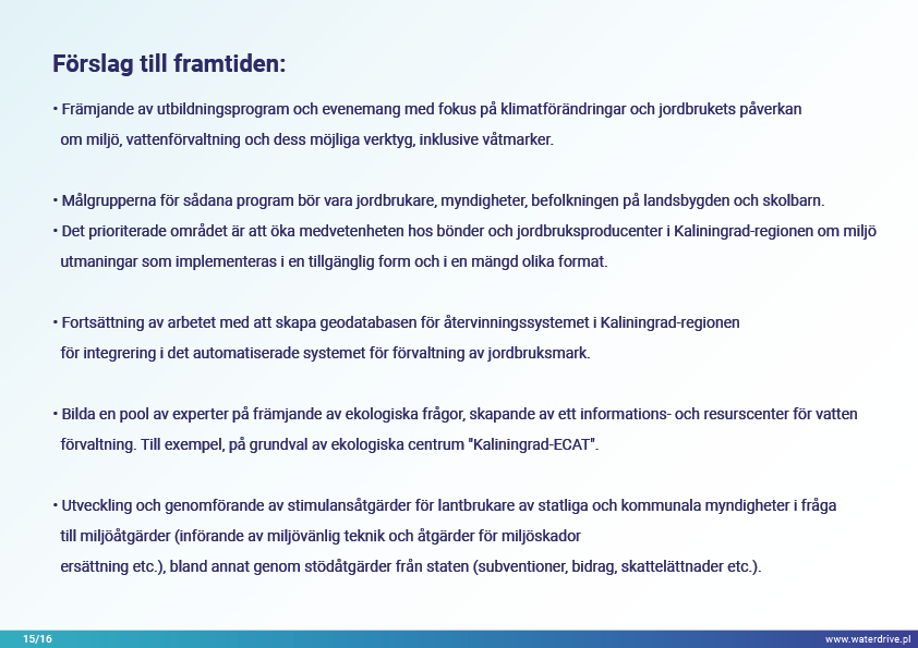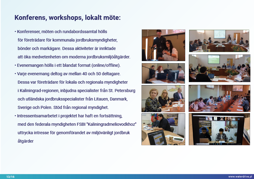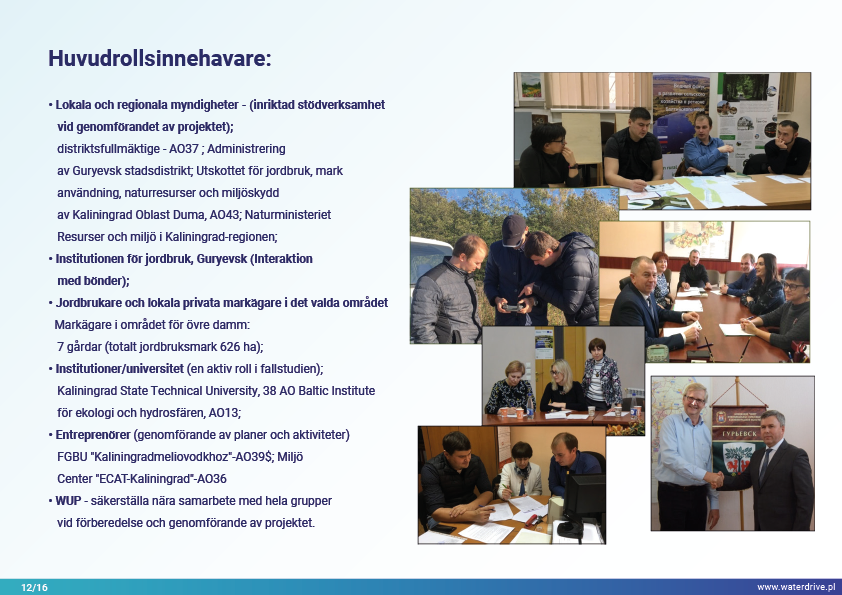 Guryevkafloden (Mühlen Fluss) är en liten flod i Kaliningradregionen vars främsta föroreningskällor är mänskliga bosättningar, industrianläggningar och jordbruk. Under Waterdrive-projektet genomfördes vattenkvalitetsövervakning och visade att kväve- och fosforhalterna ökar med flodens flöde från källan till mynningen. Resultaten av förstudien om anläggande av konstgjorda våtmarker presenterades, liksom de pågående aktiviteterna i samband med restaurering av markbehandlingssystem. Ett flertal konferenser, möten och "rundabordssamtal" hölls för att öka medvetenheten om moderna miljöåtgärder inom jordbruket.